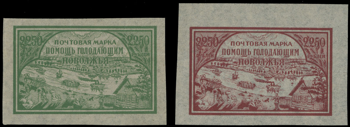 1922, Volga Famine Relief issue, 2250 green and 2250 red, two values printed on thin paper, full OG, NH (B15a) or VLH, VF, C.v. $200, Est. $150-$180 , Scott #B14a, B15a