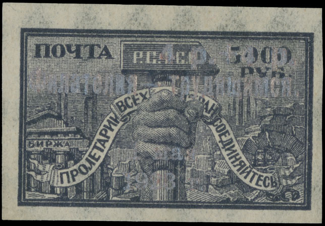 1923, Philately for the Labor, silver surcharge 4r+4r on 5000r violet, two tiny spots of missing gum at the bottom, otherwise full OG, NH, VF, C.v. $1,800, Est. $1,000-$1,200 , Scott #B42