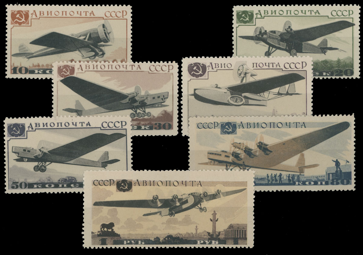 1937, Aviation Exhibition, 10k-1r, complete set of seven, full OG, NH, mostly VF, C.v. $174, Est. $150-$180 , Scott #C69-75