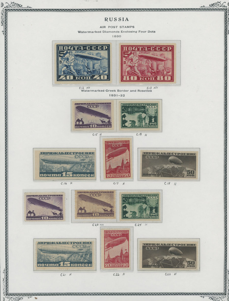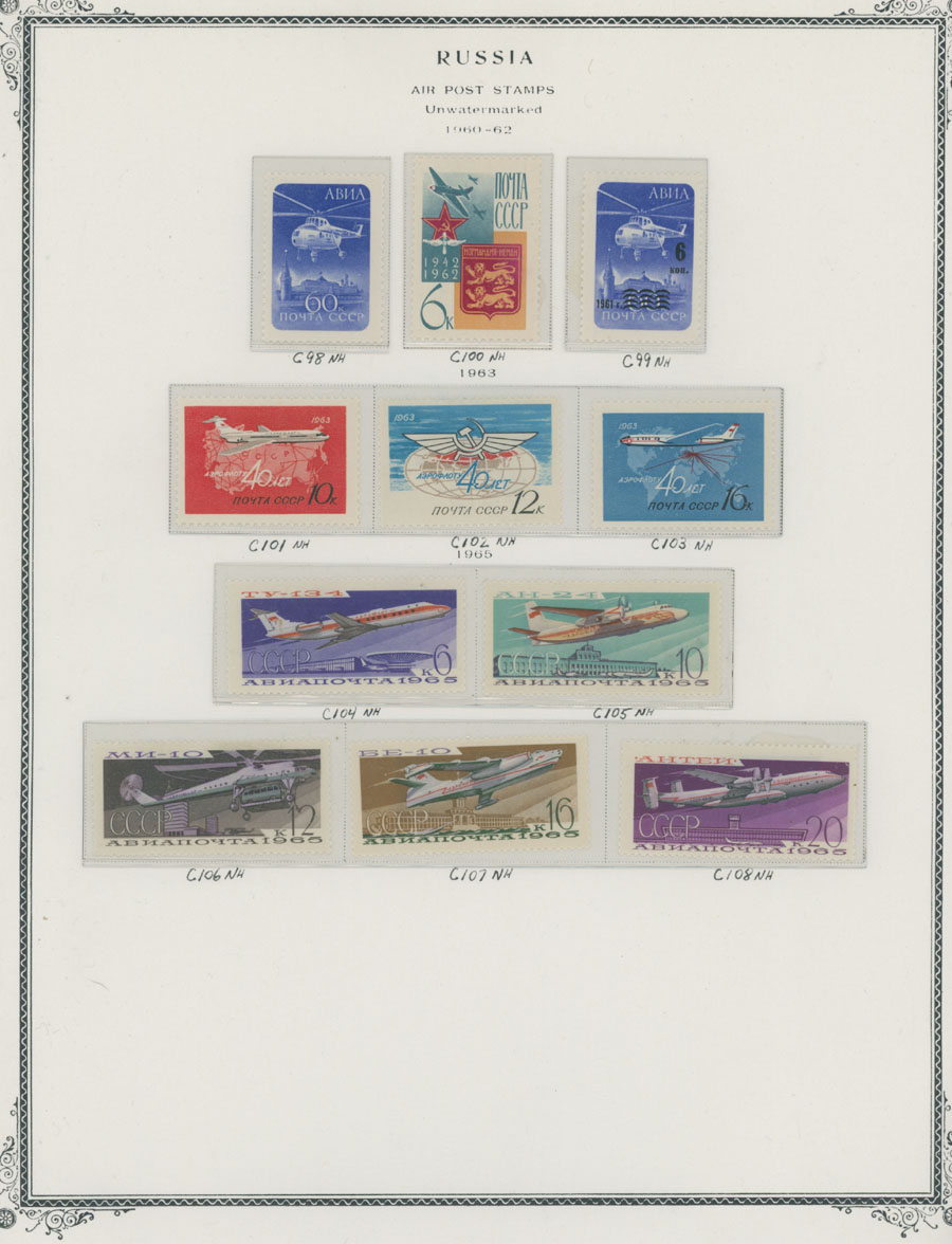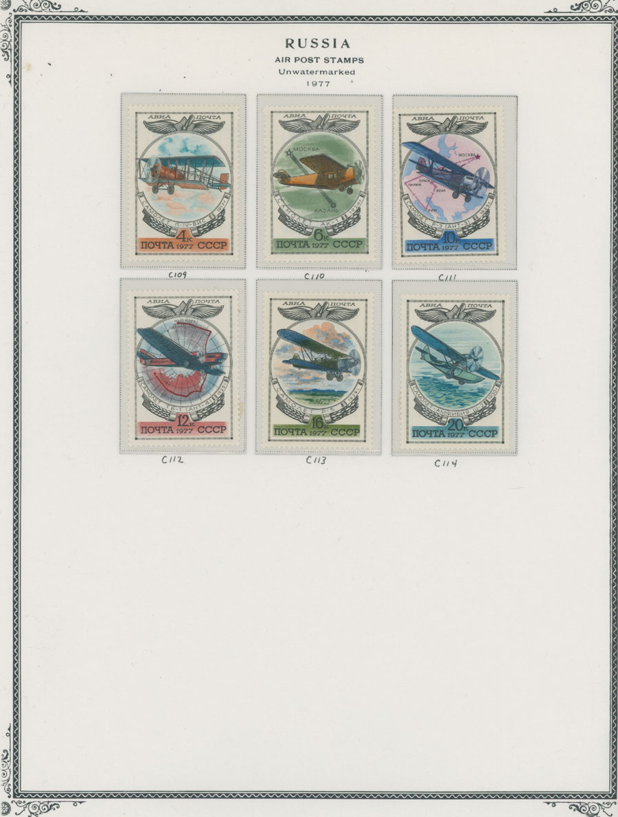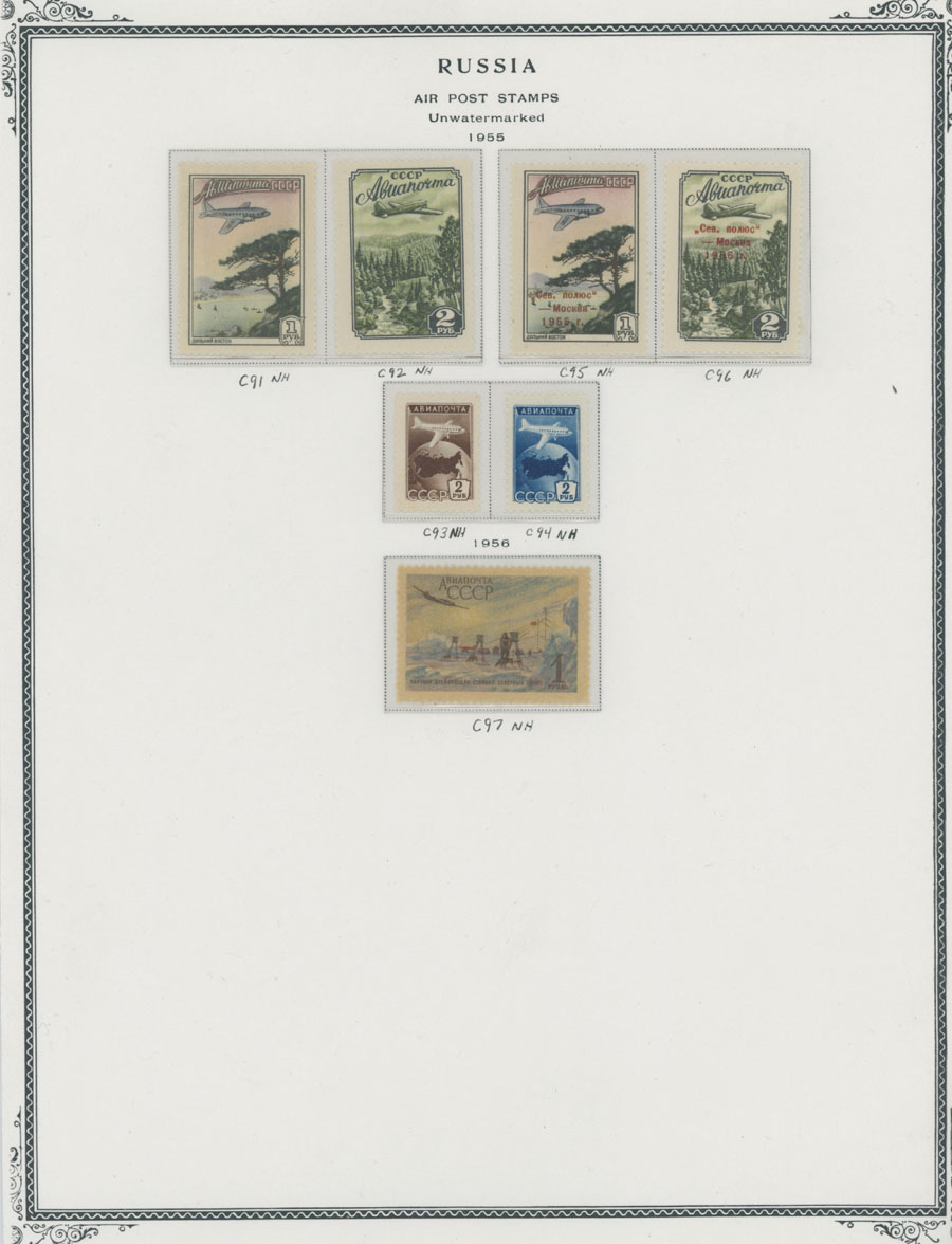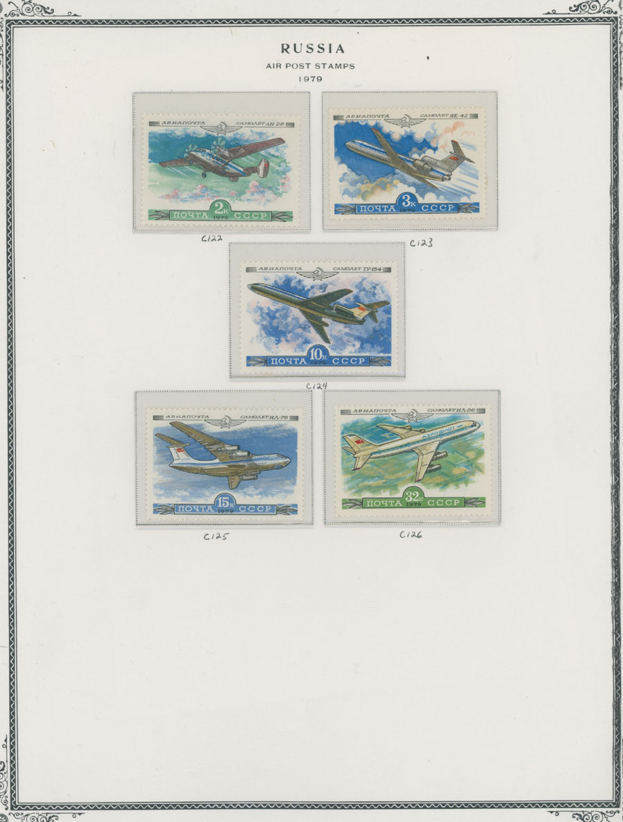 COMPLETE AIR POST AND BACK OF THE BOOK COLLECTION: 1922-79, about 150 mint stamps arranged on Scott pages in mounts, never hinged stamps included – five early issues (No.C1-13), Malygin imperf set, Polar Year, vertical Balloons and Civil Aviation with no watermark, Stratosphere Disaster and Airships of 1934, Moscow – San Francisco Flight, and all later issues except No.C75a, in addition Special Delivery set LH and complete Postage Dues – NH/LH, fresh quality unit, C.v. is about $8,000, Est. $3,000-$4,000, Scott #C1-126, CO2, E1-3, J1-24