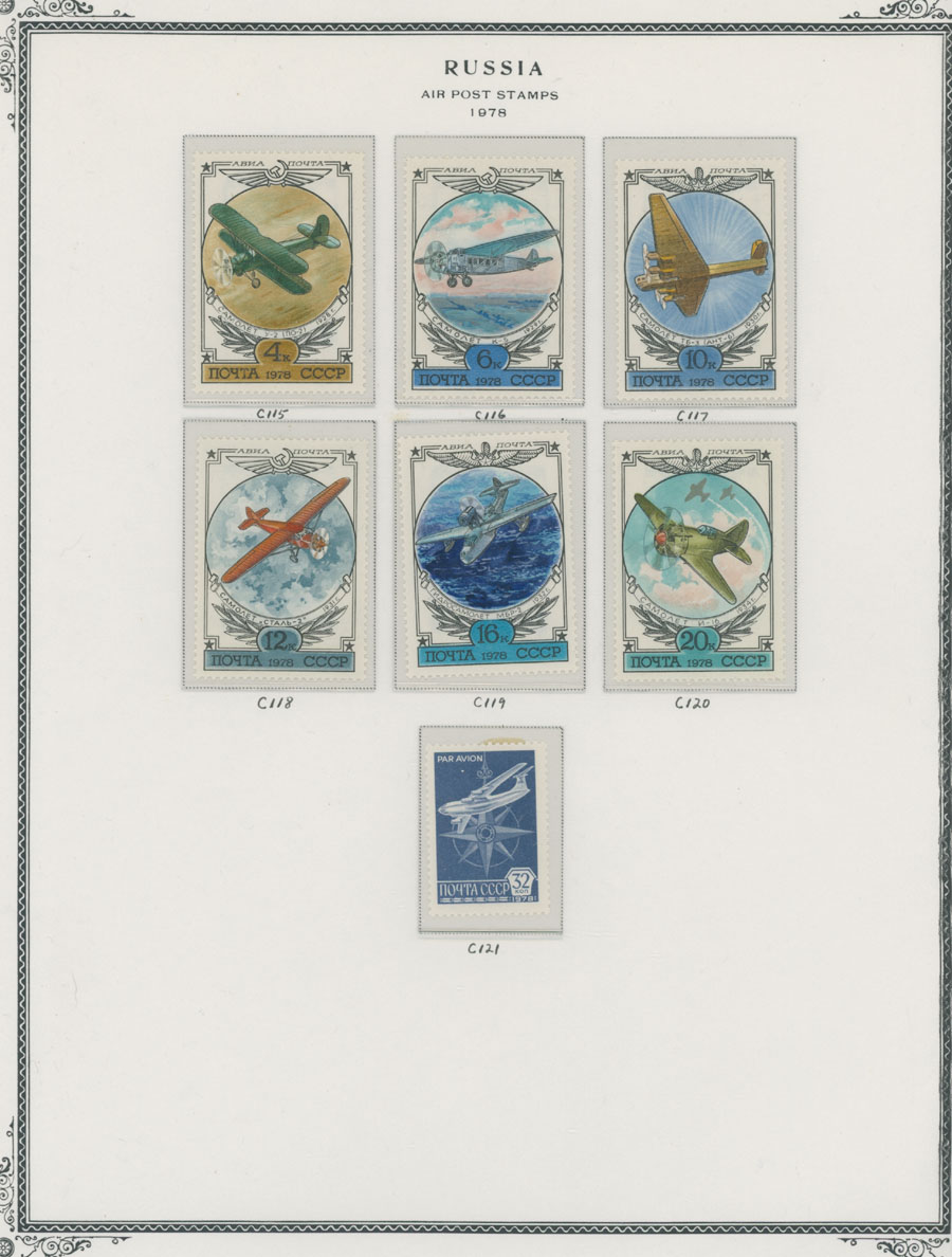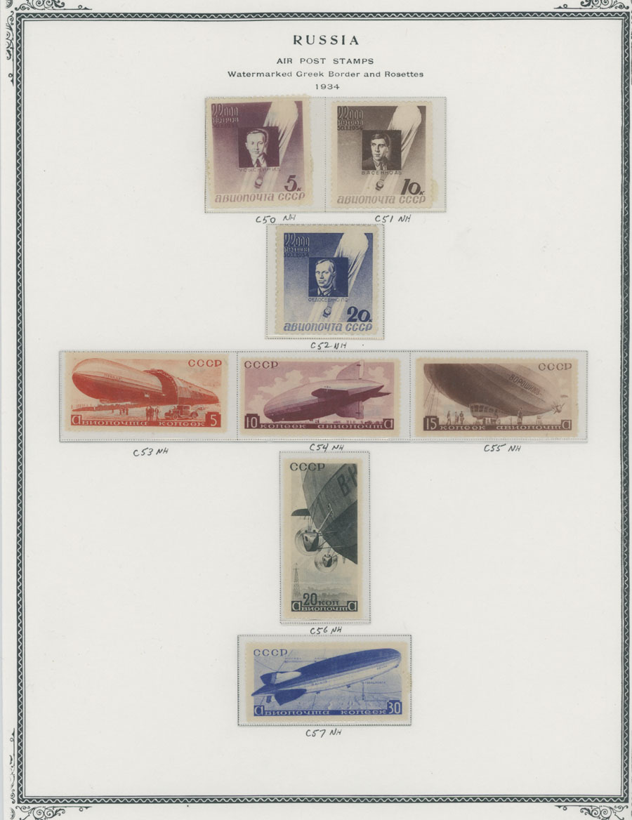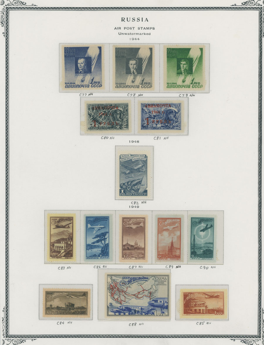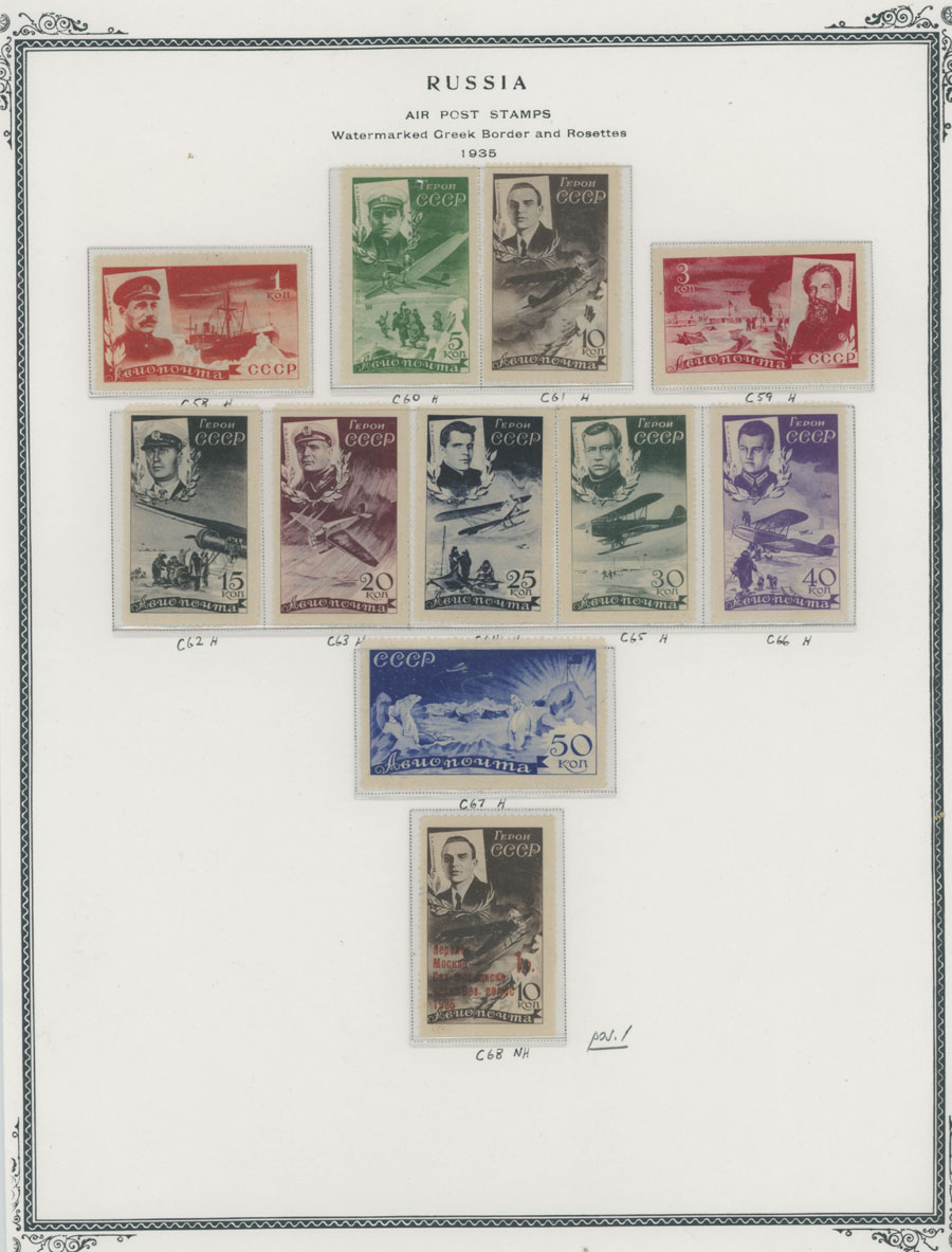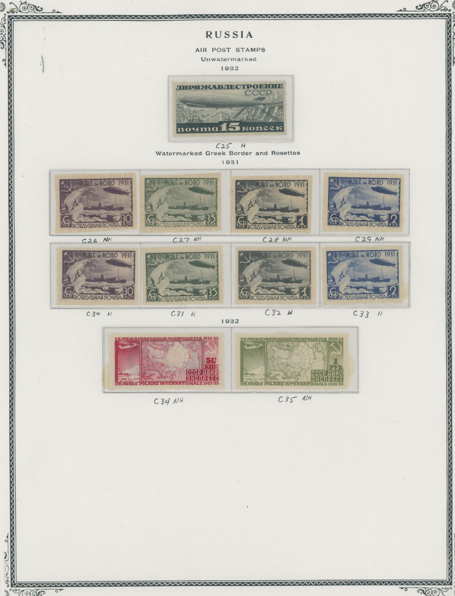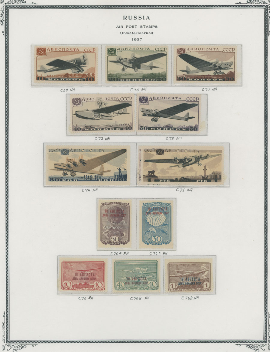 COMPLETE AIR POST AND BACK OF THE BOOK COLLECTION: 1922-79, about 150 mint stamps arranged on Scott pages in mounts, never hinged stamps included – five early issues (No.C1-13), Malygin imperf set, Polar Year, vertical Balloons and Civil Aviation with no watermark, Stratosphere Disaster and Airships of 1934, Moscow – San Francisco Flight, and all later issues except No.C75a, in addition Special Delivery set LH and complete Postage Dues – NH/LH, fresh quality unit, C.v. is about $8,000, Est. $3,000-$4,000, Scott #C1-126, CO2, E1-3, J1-24