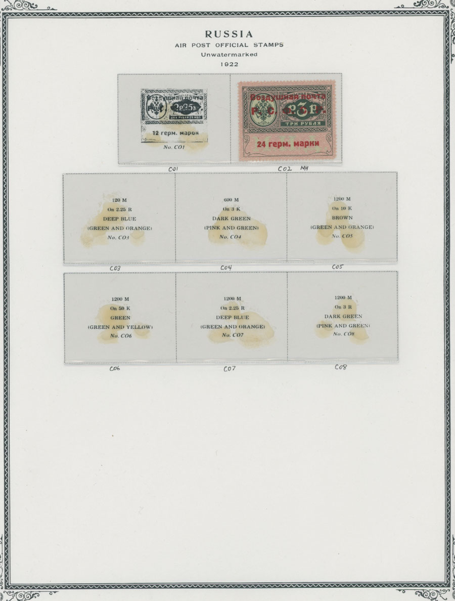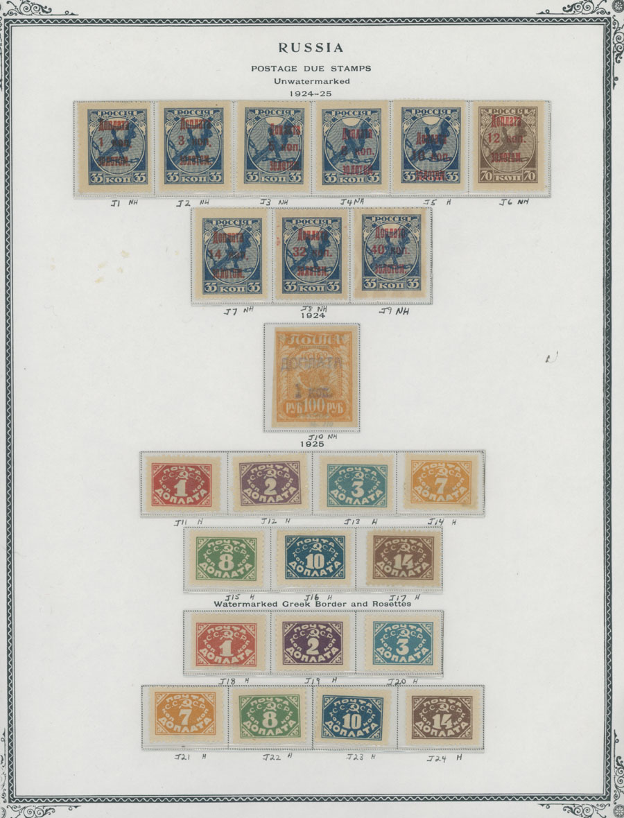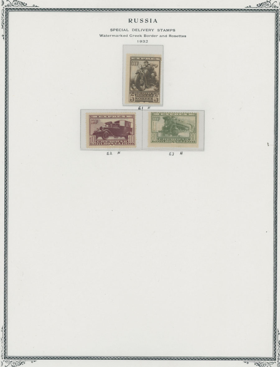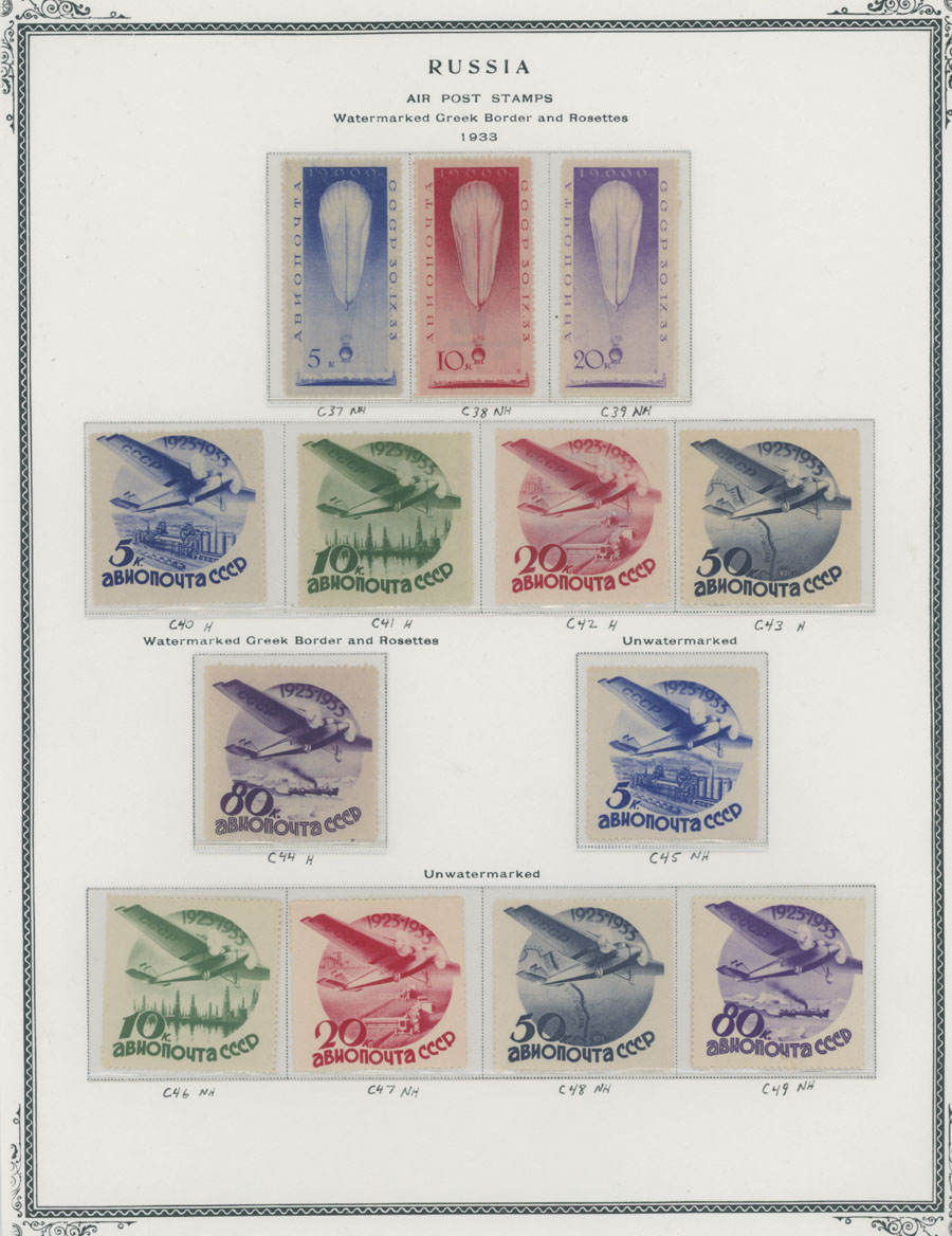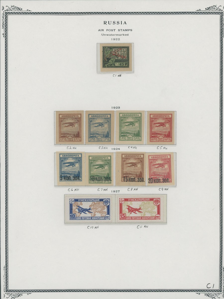 COMPLETE AIR POST AND BACK OF THE BOOK COLLECTION: 1922-79, about 150 mint stamps arranged on Scott pages in mounts, never hinged stamps included – five early issues (No.C1-13), Malygin imperf set, Polar Year, vertical Balloons and Civil Aviation with no watermark, Stratosphere Disaster and Airships of 1934, Moscow – San Francisco Flight, and all later issues except No.C75a, in addition Special Delivery set LH and complete Postage Dues – NH/LH, fresh quality unit, C.v. is about $8,000, Est. $3,000-$4,000, Scott #C1-126, CO2, E1-3, J1-24