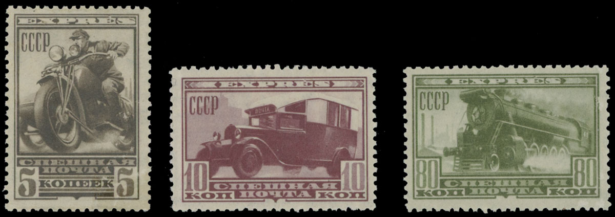 1932, Postal Transports, 5k, 10k and 80k, complete set of three, full OG, NH, VF, C.v. $338, Est. $200-$250 , Scott #E1-3