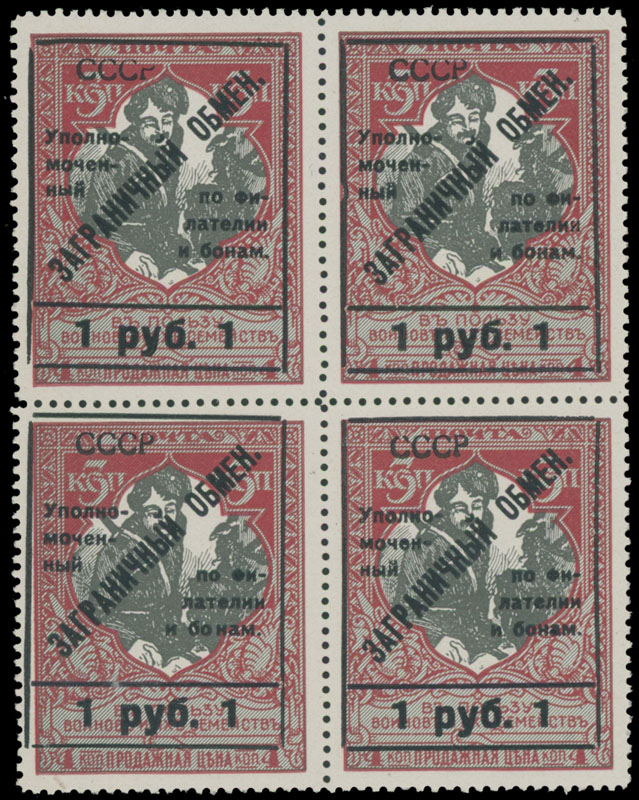 1925, the second issue, black surcharge 1r on World War I Charity stamp of 3+1k red and gray, perforation 12½, block of four, full OG, NH, VF and scarce multiple, Standard Cat. #PE12 A, C.v. $640++, Est. $250-$300