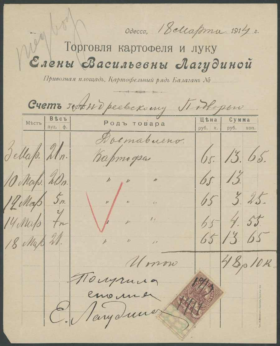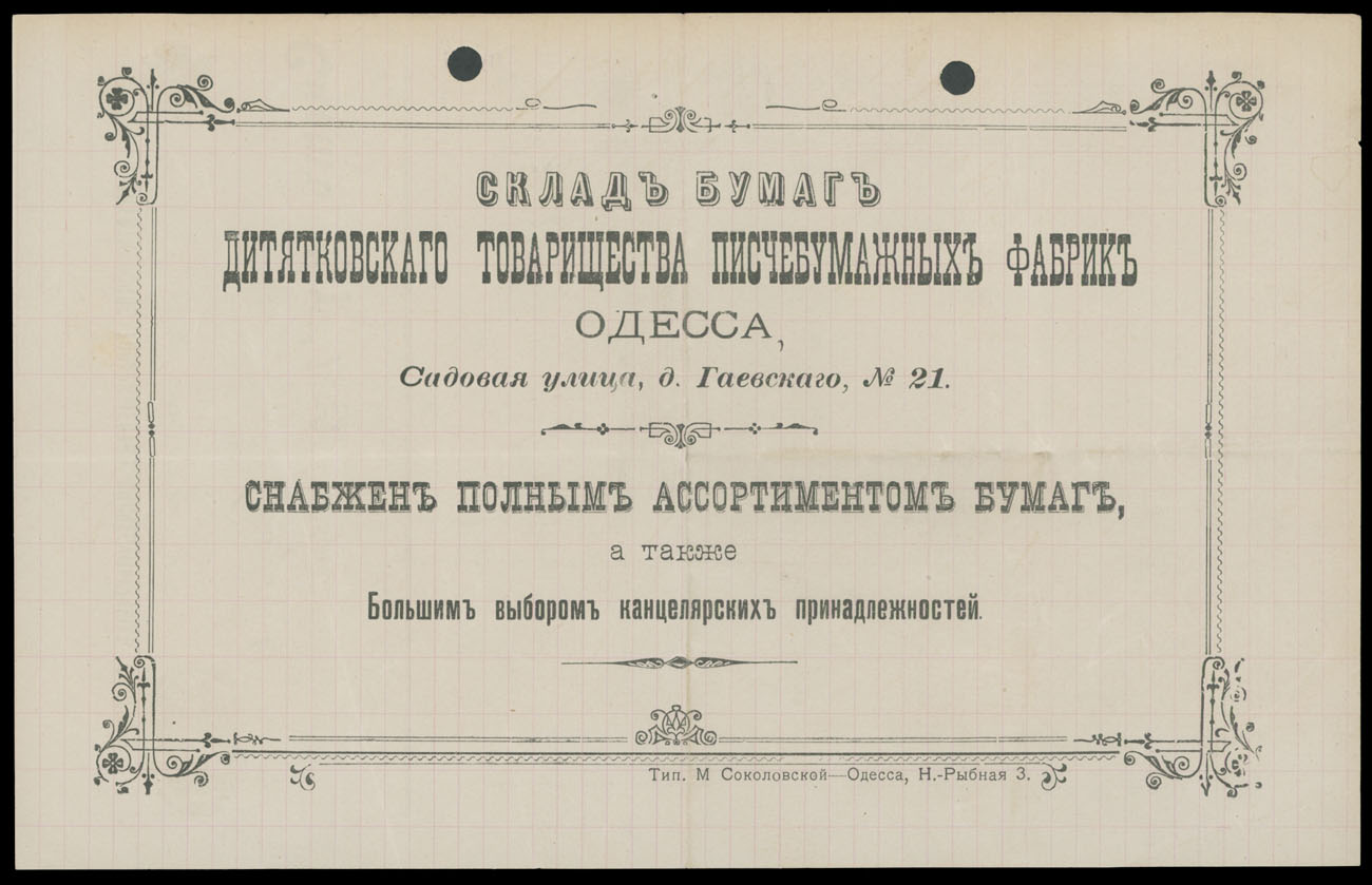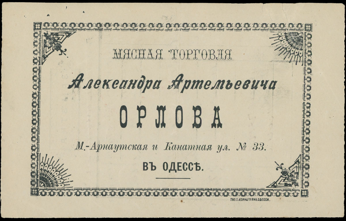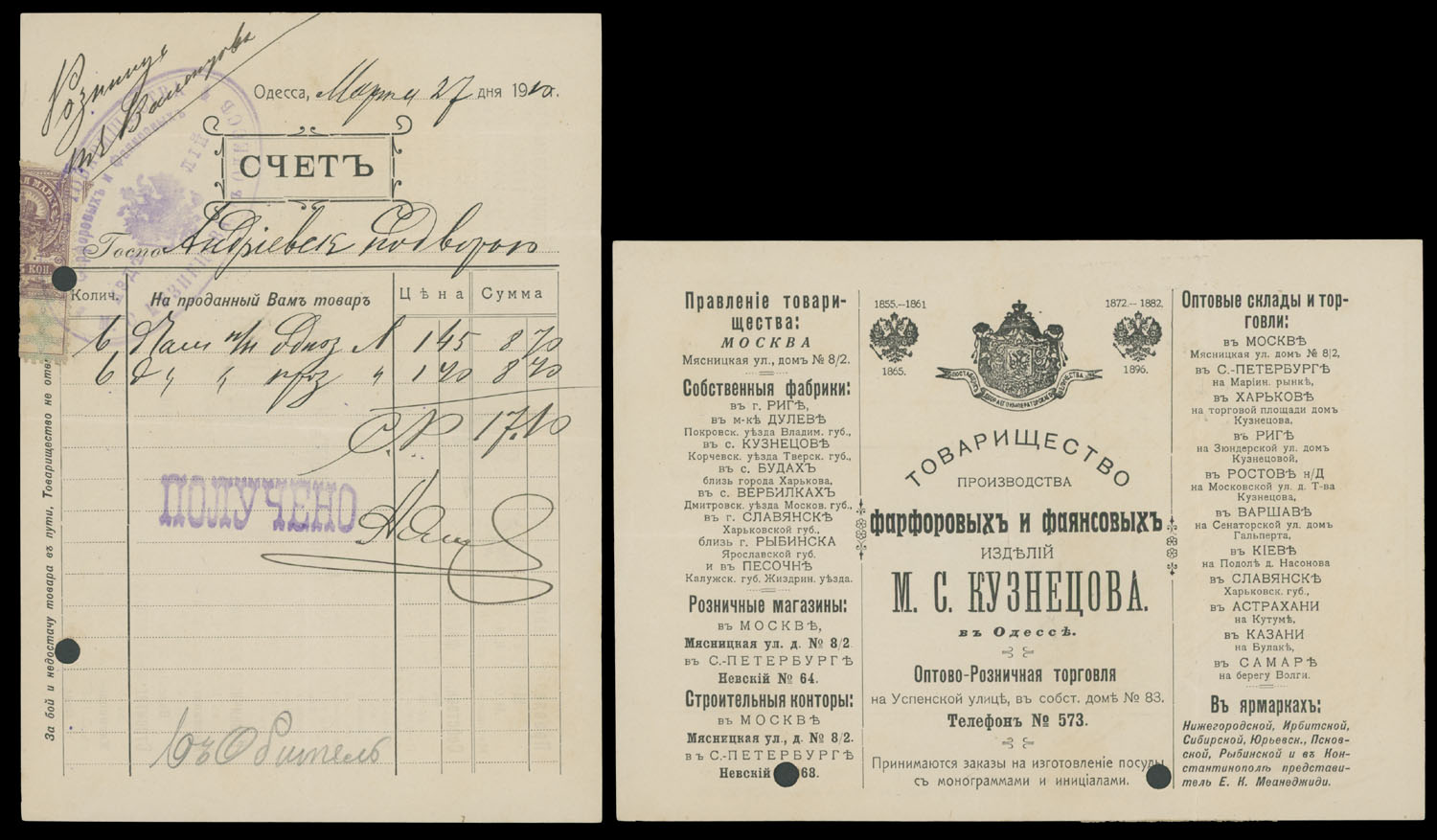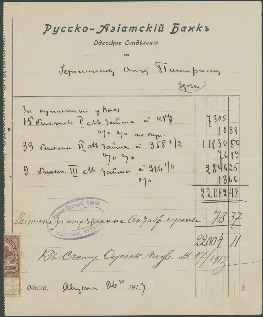 ODESSA FISCAL DOCUMENTS: 1905-17, 13 items, including official receipts, statements, bills and etc., eight pieces are bearing Imperial fiscal stamps of 5k or 10k, some with pre-printed advertisements, archival punches, folds and somewhat ageing, still collectible quality material, F/VF, Est. $600-$700