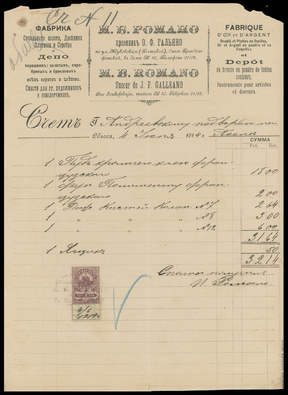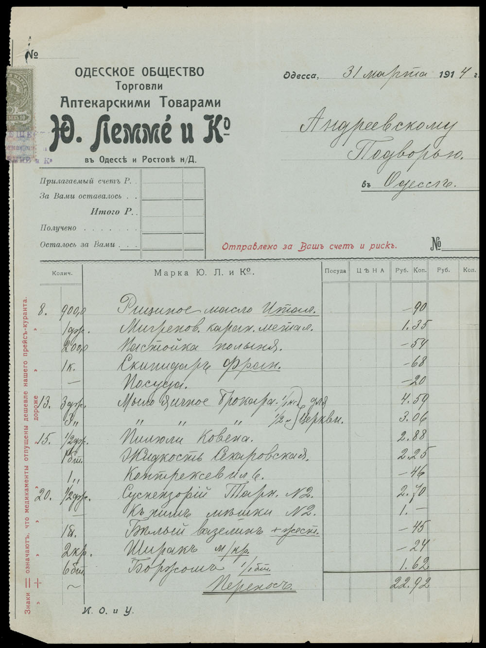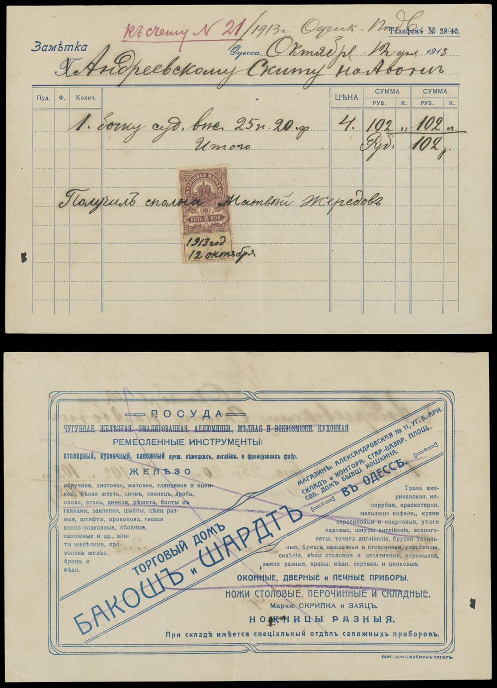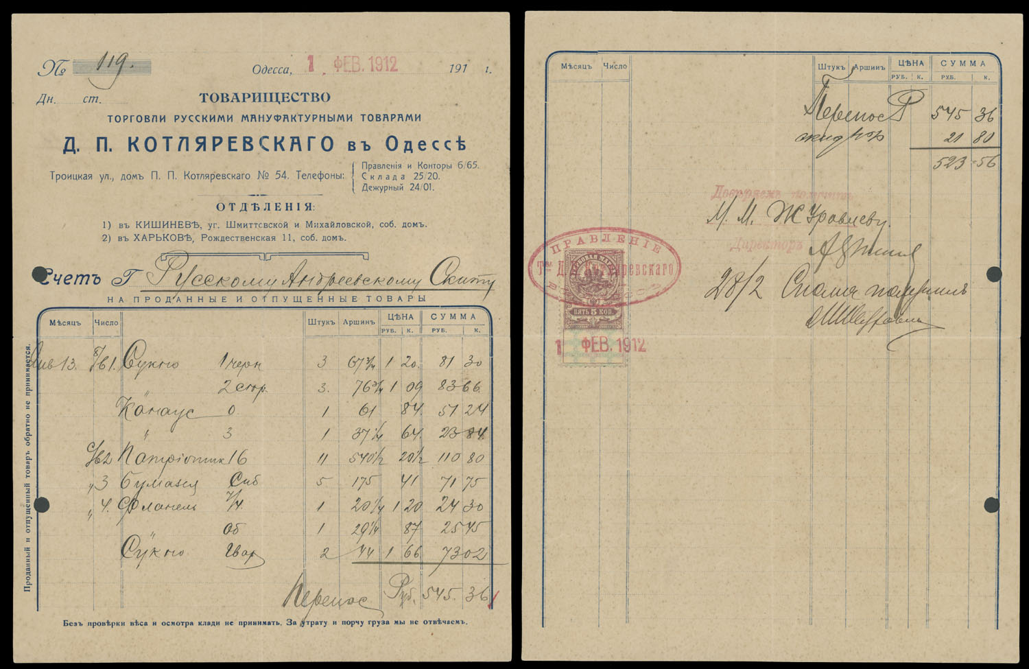 ODESSA FISCAL DOCUMENTS: 1905-17, 13 items, including official receipts, statements, bills and etc., eight pieces are bearing Imperial fiscal stamps of 5k or 10k, some with pre-printed advertisements, archival punches, folds and somewhat ageing, still collectible quality material, F/VF, Est. $600-$700