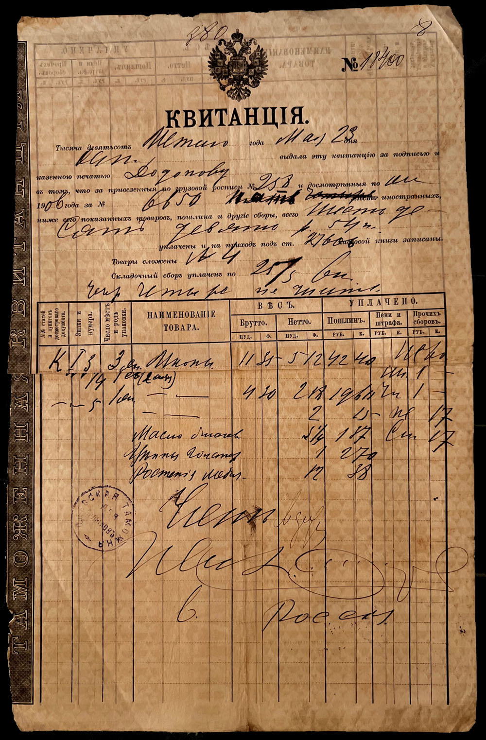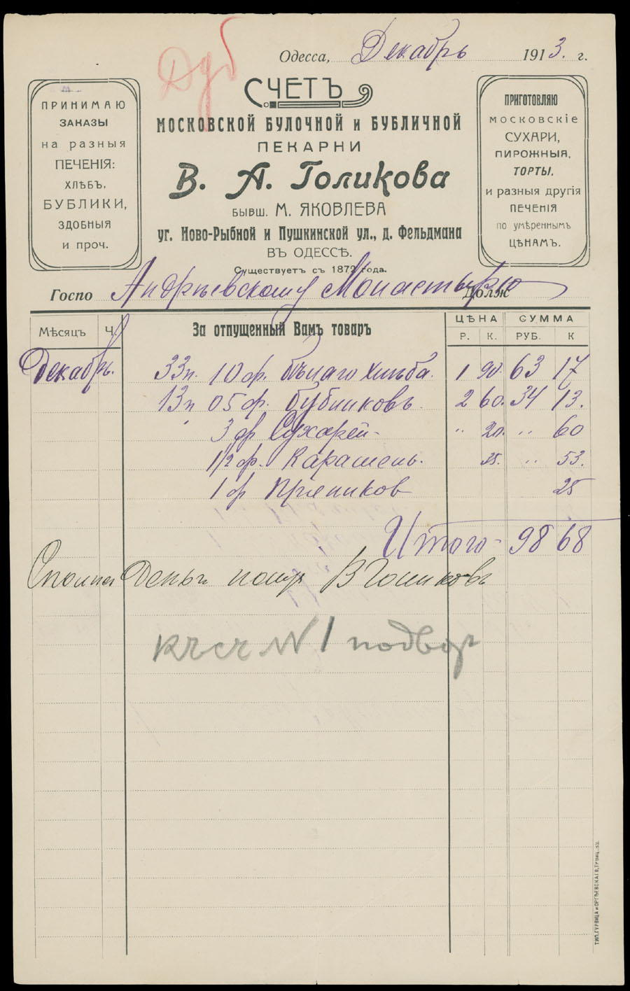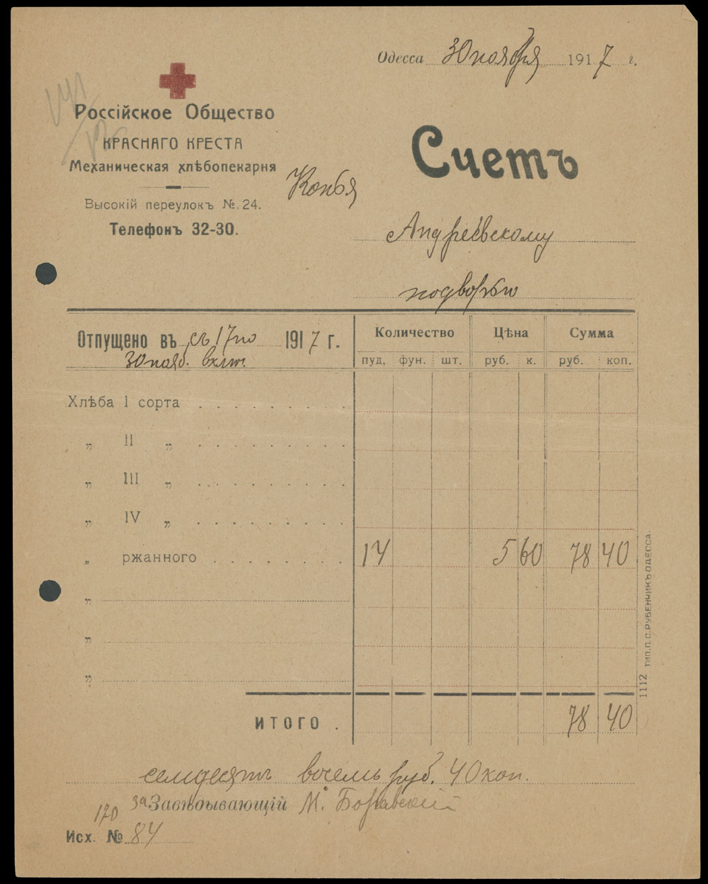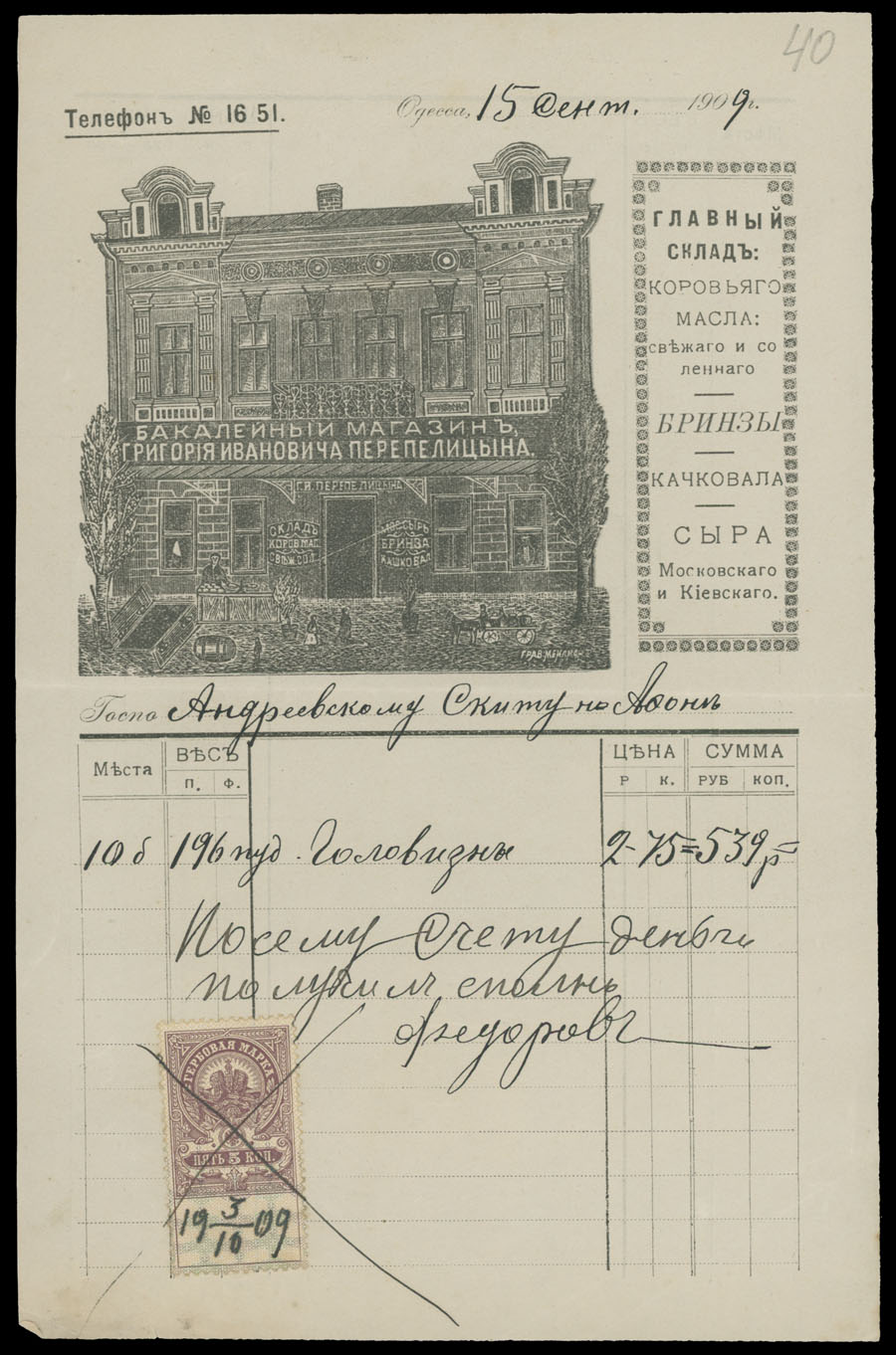 ODESSA FISCAL DOCUMENTS: 1905-17, 13 items, including official receipts, statements, bills and etc., eight pieces are bearing Imperial fiscal stamps of 5k or 10k, some with pre-printed advertisements, archival punches, folds and somewhat ageing, still collectible quality material, F/VF, Est. $600-$700