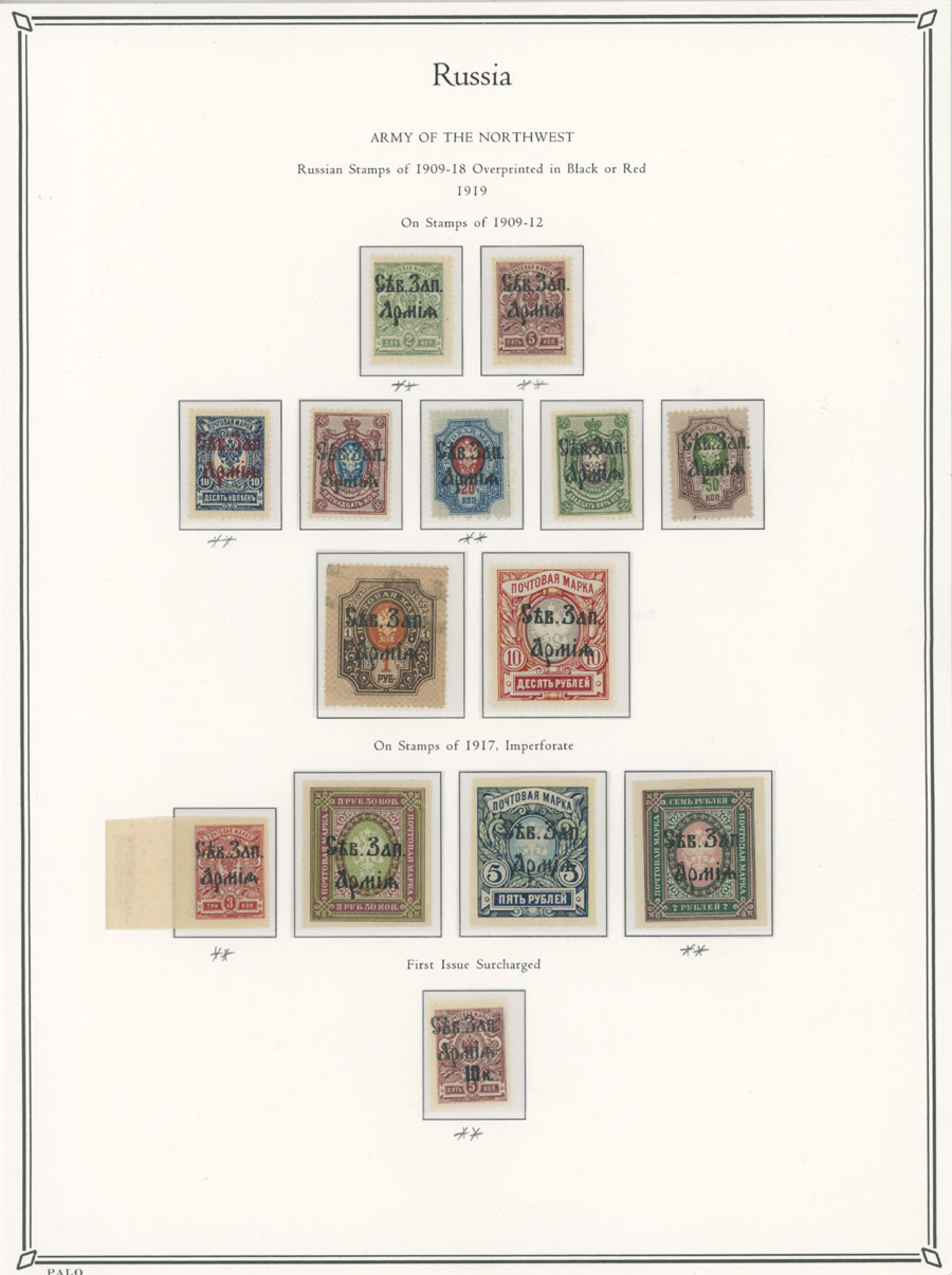 1919, black or red overprint ”Sev. Zap. Armia” on perforated 2k-10r, imperforate 3k-7r, and surcharge 10k/5k, complete unit of 14 stamps, full/large part of OG, NH (7, including imperf 7r) or hinged, F/VF, all guaranteed genuine, valuable stamps singled Romeko, Jemtschoujin, Pohl and others, C.v. $430, Est. $300-$400, Scott #1-14
