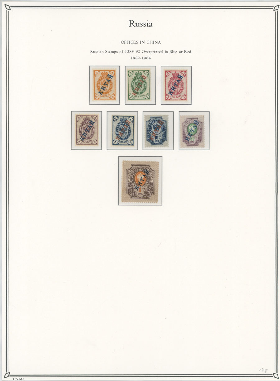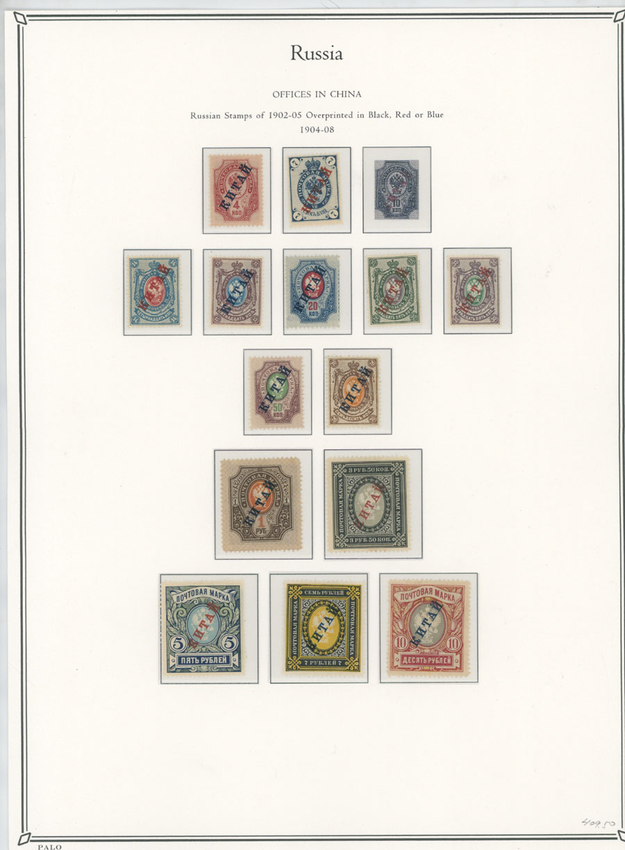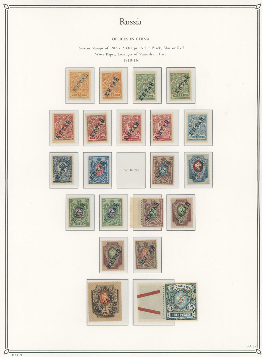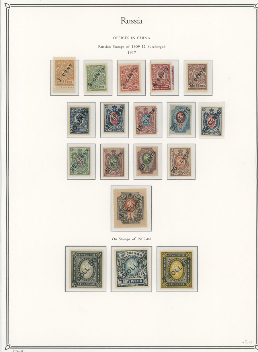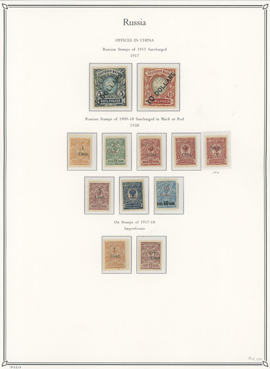 WELL-COMPLETED COLLECTION ON ILLUSTRATED PAGES: 1899- 1920, Diagonal overprints ”Kitay”, surcharges in ”cents” and ”dollars”, 73 stamps, including No.1-8 (NH), 9/23 (no 10k), 24/47 (no blue overprint on 14k), 50-63, 64-70 and 72-80 with inverted 4c on 4k carmine, full/large part of OG, some NH, mainly LH/hinged, F/VF, C.v. is about $1,600 as hinged, Est. $800-$900, Scott #1/80