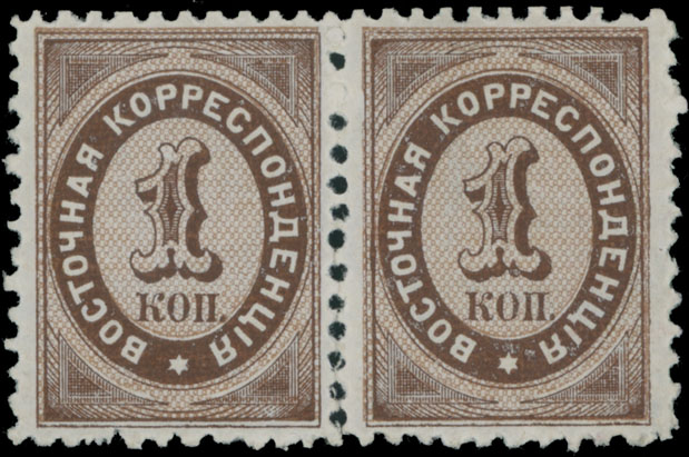 1868, Numerals, 1k brown, perforation 11½, horizontal pair printed on horizontally laid paper, some perf separation, full OG, NH or VLH, VF, C.v. $100 as hinged, M. Kramarenko ”Russika” #12, C.v. $350++, Est. $200-$250 , Scott #8