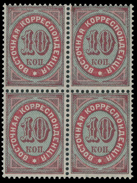 1890, Numerals, 10k carmine and green, block of four with harrow perforation 14½x15, printed on horizontally laid paper, full OG, NH, VF, M. Kramarenko ”Russika” #50, C.v. $300, Est. $150-$180 , Scott #15