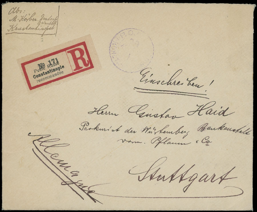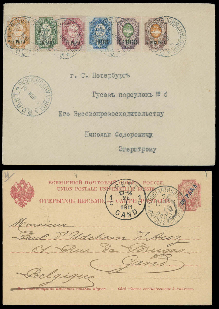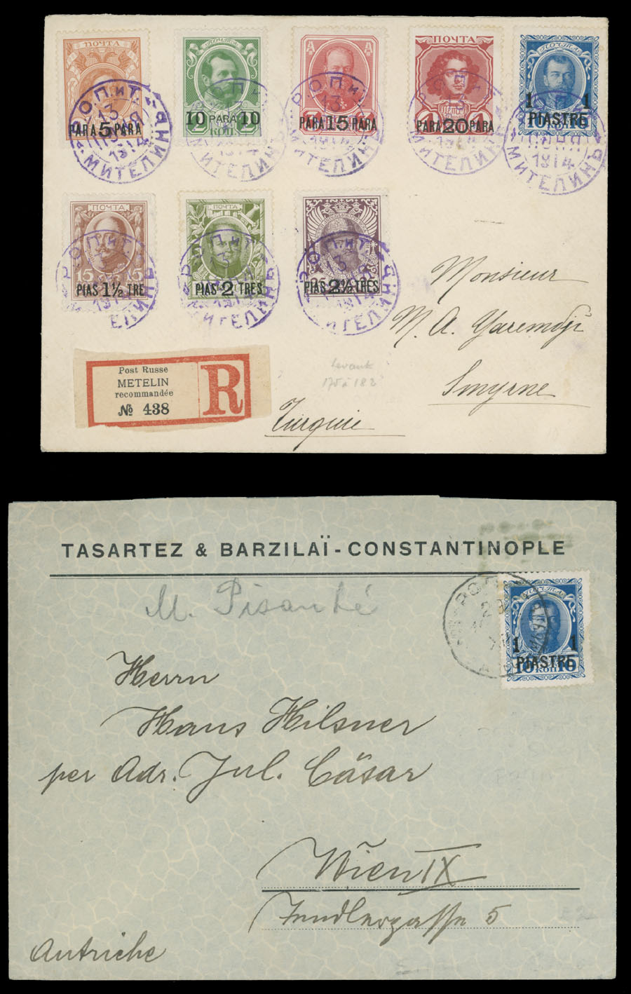 POSTAL HISTORY ITEMS – SELECTION: 1909-14, seven items, including six covers and one postal stationery card, franked by Jubilee R.O.P.iT. 5pa/1k-7pi/70k, and various Romanov Dynasty surcharges, most originated from Constantinople (6) and Metelin, addressed to St. Petersburg, Turkish Empire, Germany and Austria, nice and fresh quality, F/VF, Est. $300-$400, Scott #40/220