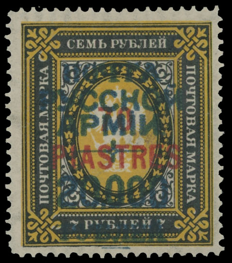 1921, blue surcharge 20,000r over red surcharge 70pi on 7r black and yellow, printed on vertically laid paper, full OG, previously hinged, VF, C.v. $400, Est. $200-$250 , Scott #284C