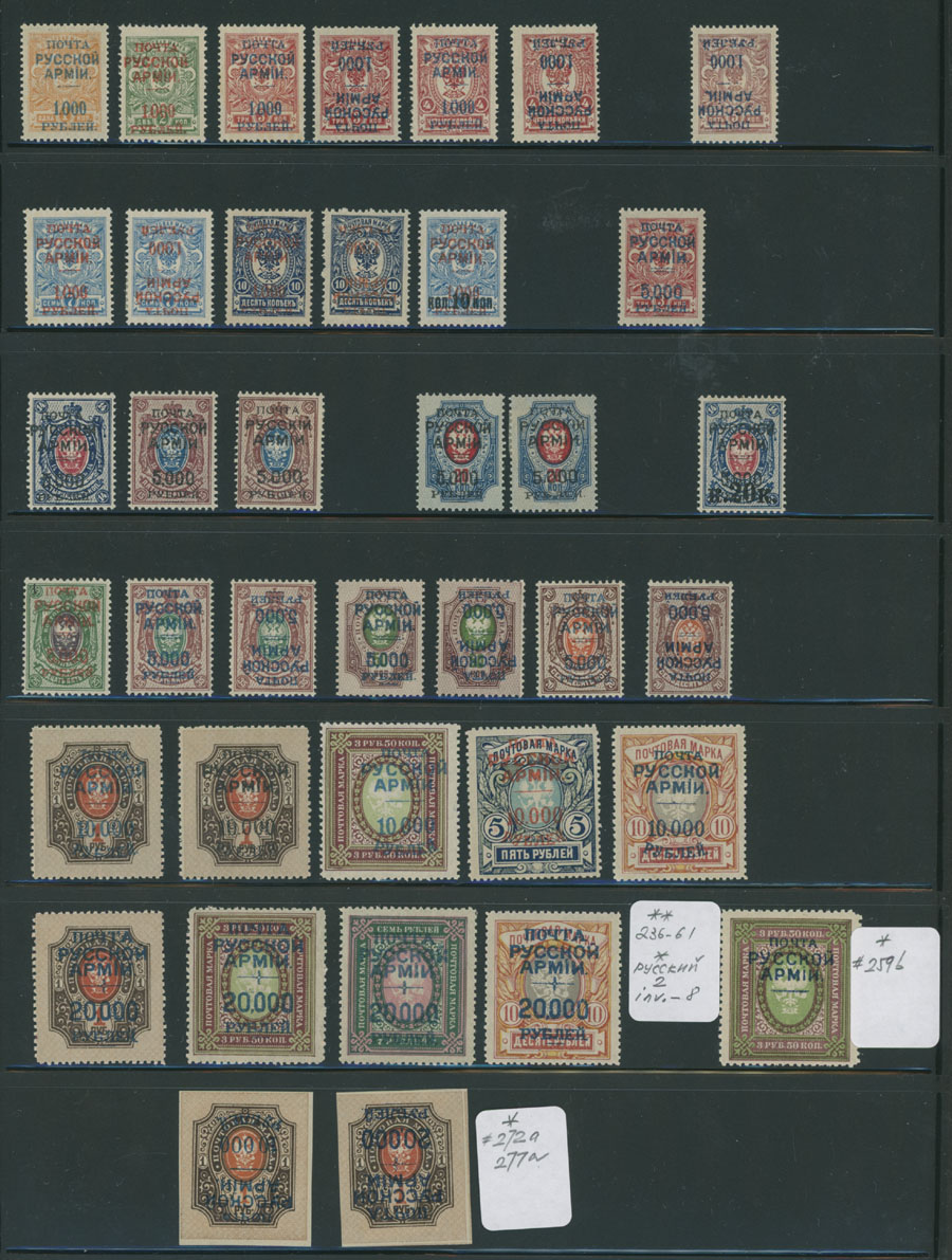 SELECTION ON VARIO PAGE: 1921, 87 mint stamps, representing four complete issues with additional errors, including type I surcharges on Imperial perf stamps with 9 errors, two inverted surcharges on imperf 1r, revaluation on Saving stamps with 4 inverts, overprints type II over Ukrainian tridents, set of 13 plus 7 inverts, the same surcharges on Imperial stamps and over Russian Levant stamps, full OG, NH (common stamps) or LH (varieties), mostly VF, C.v. is about $600 for hinged stamps, Est. $500-$600, Scott #236/375