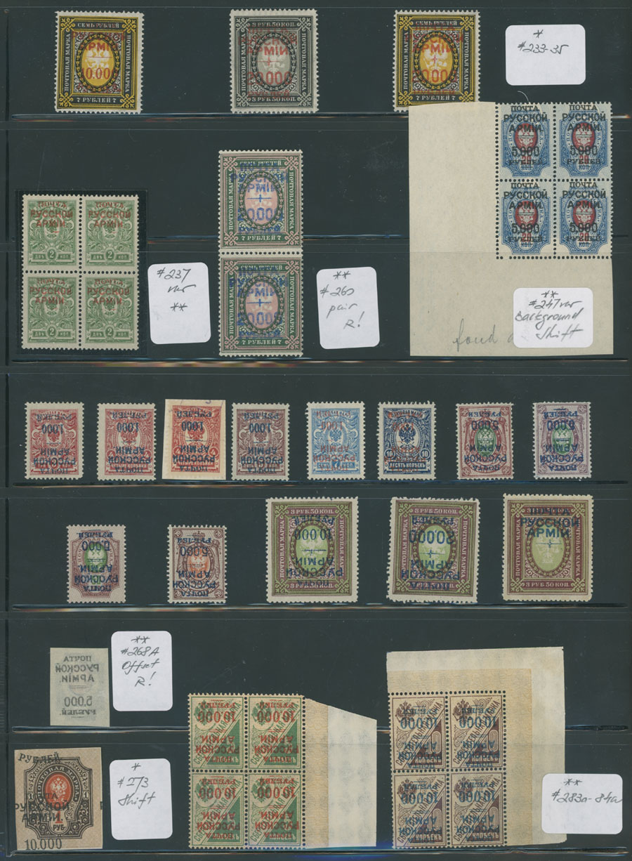 GROUP OF VALUABLE STAMPS AND ERRORS: 1921, 60 mostly mint stamps, including 3 pairs and 6 blocks of four, representing No.233-35 (LH, C.v. $250 each), No.260 in NH vertical pair (C.v. $195 as hinged), No.268A, NH with offset on gum side, No.299, 307A in pair and 312 – all LH, rare overprints over Ukrainian tridents, including 10,000r over Odessa 1 on 10k/7k in NH pair and many more, full/large part of OG or used (6), F/VF, Est. $800-$900