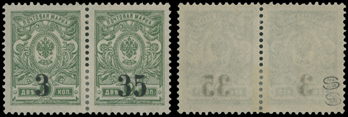 1919, black surcharge 35(k) on 2k green, horizontal pair, left stamp with missing ”5” in the surcharge variety, full OG, LH, VF Soviet Philatelic guarantee hs, C.v. $150++, Est. $100-$120 , Scott #1, b