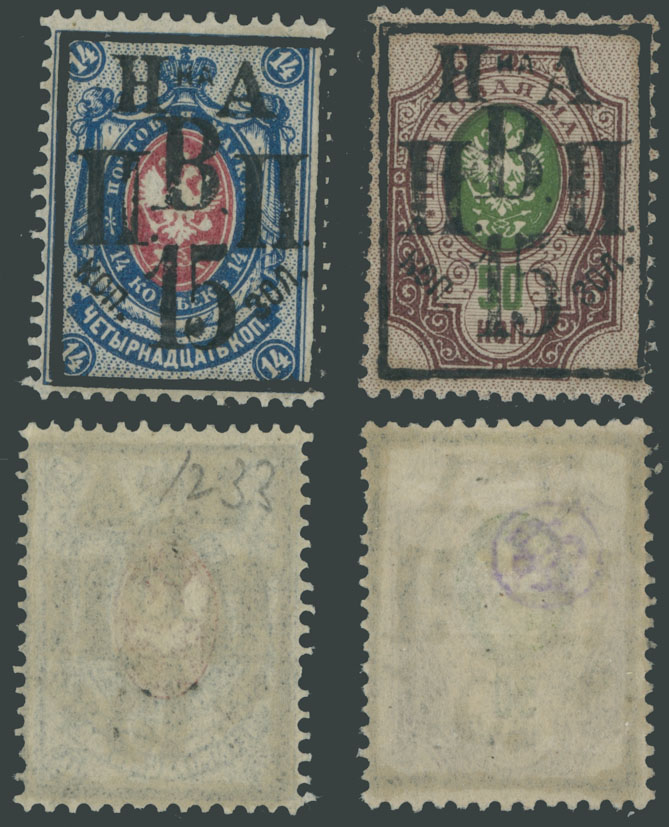 1921, black handstamped surcharges 15k on perforated stamps of 14k blue and carmine and on 50k violet and green, full OG, NH (15k/14k) or VLH, VF, guaranteed genuine, the last one with S. Pappadopulo guarantee hs, C.v. $275 as hinged, M. Kramarenko ”Russika” #6, 9, C.v. $550, Est. $300-$350, Scott #53, 56