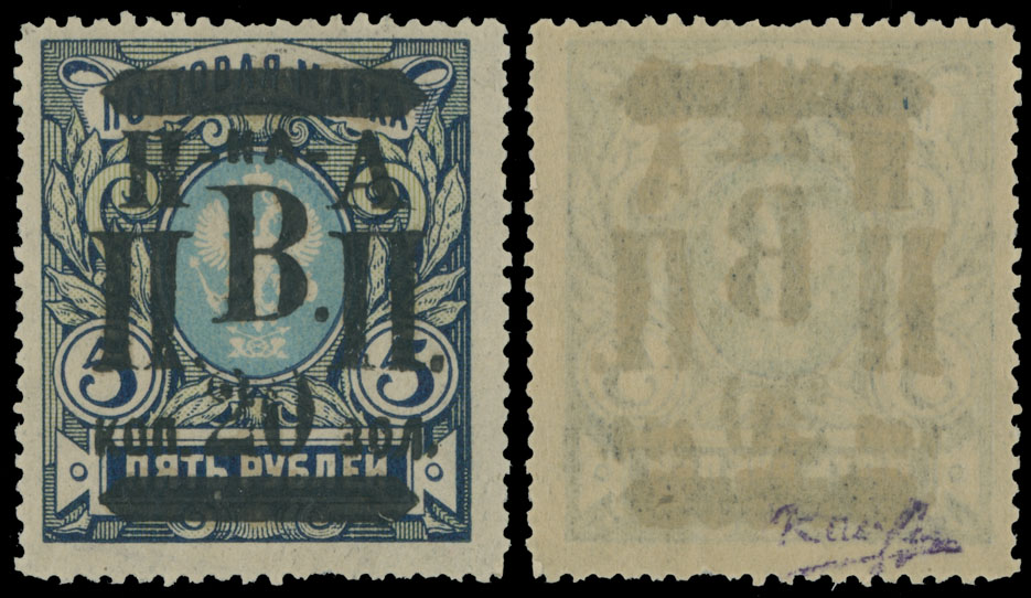 1921, black handstamped surcharge 20k on perforated stamp of 5r dark blue, green and pale blue, full OG, NH, VF, a conditional rarity, guaranteed genuine, expert’s sign on reverse, C.v. $950 as hinged, M. Kramarenko ”Russika” #13, C.v. $1,750 for hinged stamp and no value for **, Est. $1,500-$1,800, Scott #62