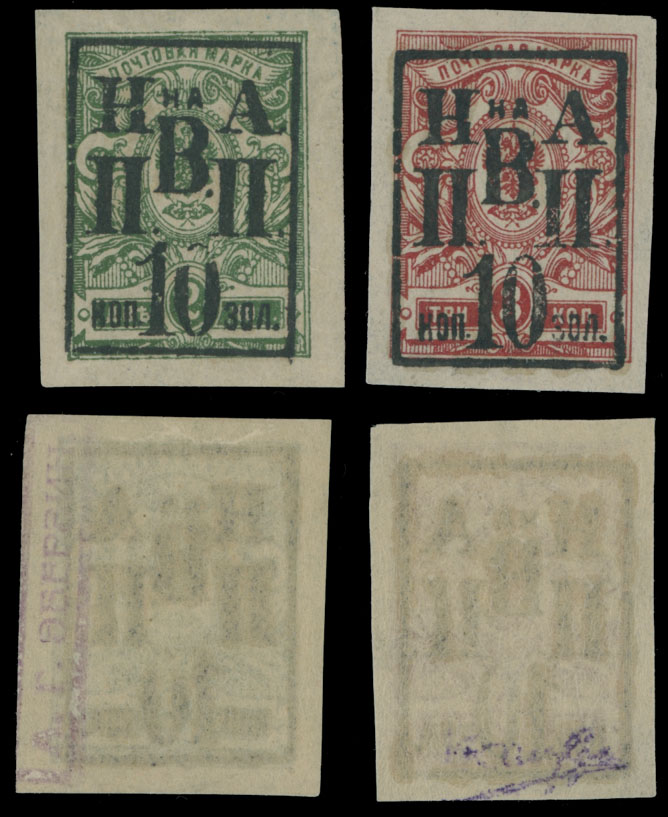 1921, black handstamped surcharge 10k on imperforate stamps of 2k green and 3k red, full OG, NH, VF and guaranteed genuine, C.v. $175 as hinged, M. Kramarenko ”Russika” #17-18, C.v. $450, Est. $300-$400 , Scott #66-67