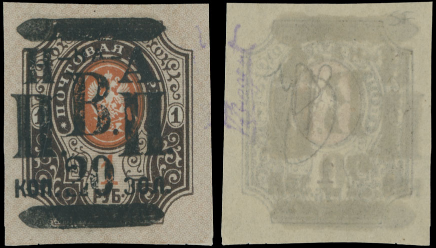1921, black handstamped surcharge 20k on imperforate stamp of 1r dark brown, pale brown and orange, slight strokes on front at right from violet expert’s hs, full OG, NH, VF and guaranteed genuine, C.v. $200 as hinged, M. Kramarenko ”Russika” #21, C.v. $525, Est. $300-$400, Scott #70