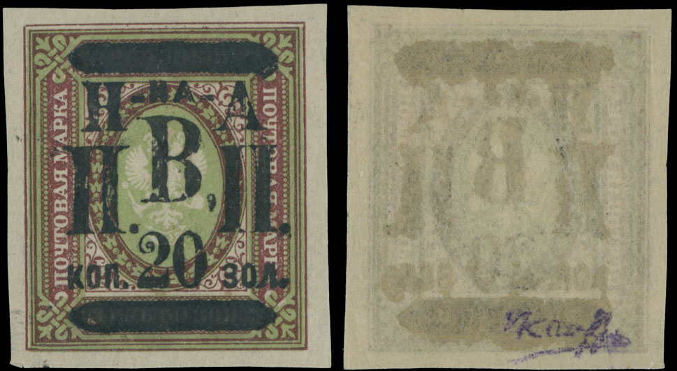 1921, black handstamped surcharge 20k on imperforate stamp of 3.50r maroon and green, full OG, NH, VF and guaranteed genuine, C.v. $325 as hinged, M. Kramarenko ”Russika” #22, C.v. $850, Est. $500-$600 , Scott #71