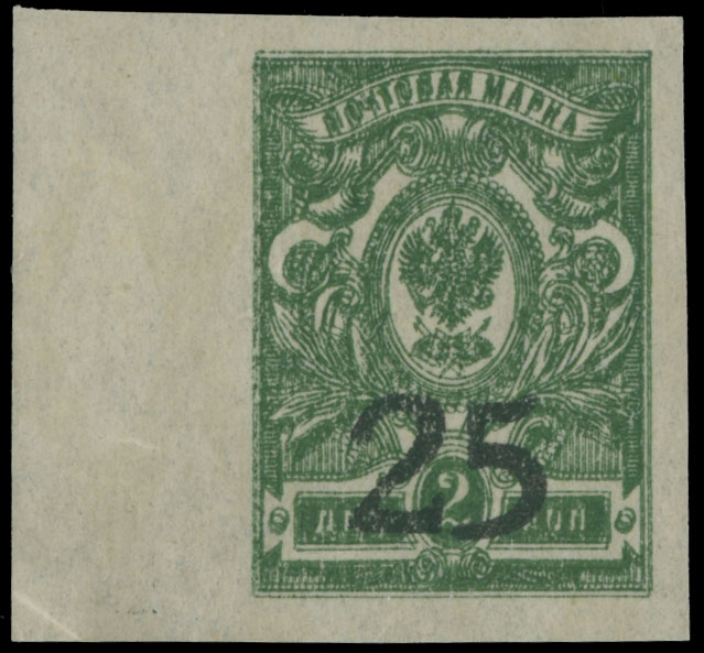 1918, black surcharge 25(k) on 2k green, left sheet margin imperforate stamp with double impression, full OG, NH (hinged on margin only), VF, C.v. $150 as hinged, Est. $100-$120 , Scott #7a