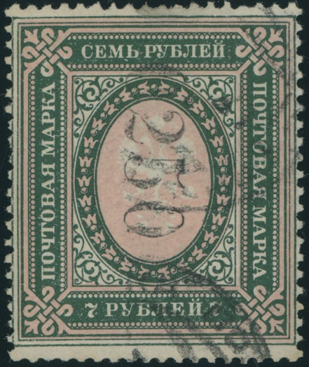 1920-21, black downward surcharge ”0250” on 7r green and pink printed on paper with horizontal varnish lines, a part of Volsk cancellation, tiny thin at two top tips of perforation, otherwise F/VF, Geyfman #3, Est. $150-$200