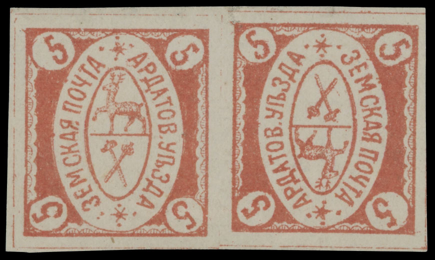 1880, 5k red, horizontal tete-beche pair printed on quadrille (4mm) paper, full OG, light trace of hinge, VF and rare, ex-Liphschutz, C.v. $6,000, Est. $1,500-$2,000 , Schmidt #6S