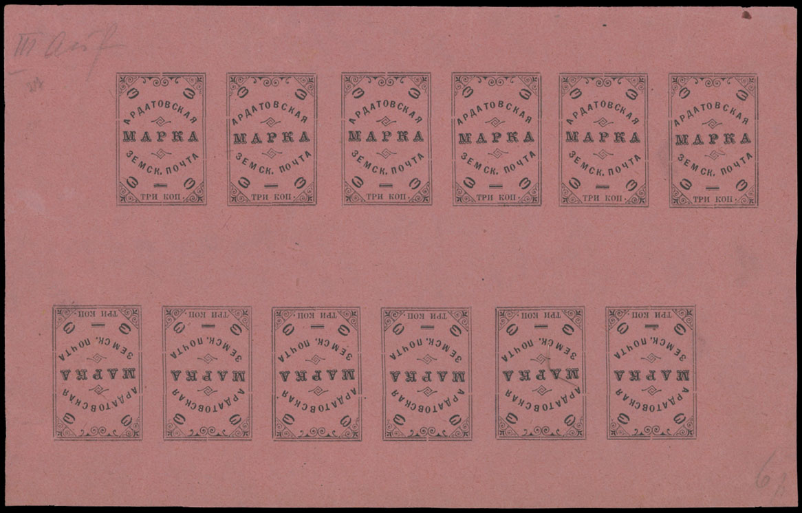 1909-10, 3k black, printed on rose paper, complete gutter tete-beche sheet of 12 (6×2), full OG, hinged at corners only one pair is hinged, others are NH, VF and rare, C.v. $3,600++, Est. $1,500-$2,000 , Schmidt #31S