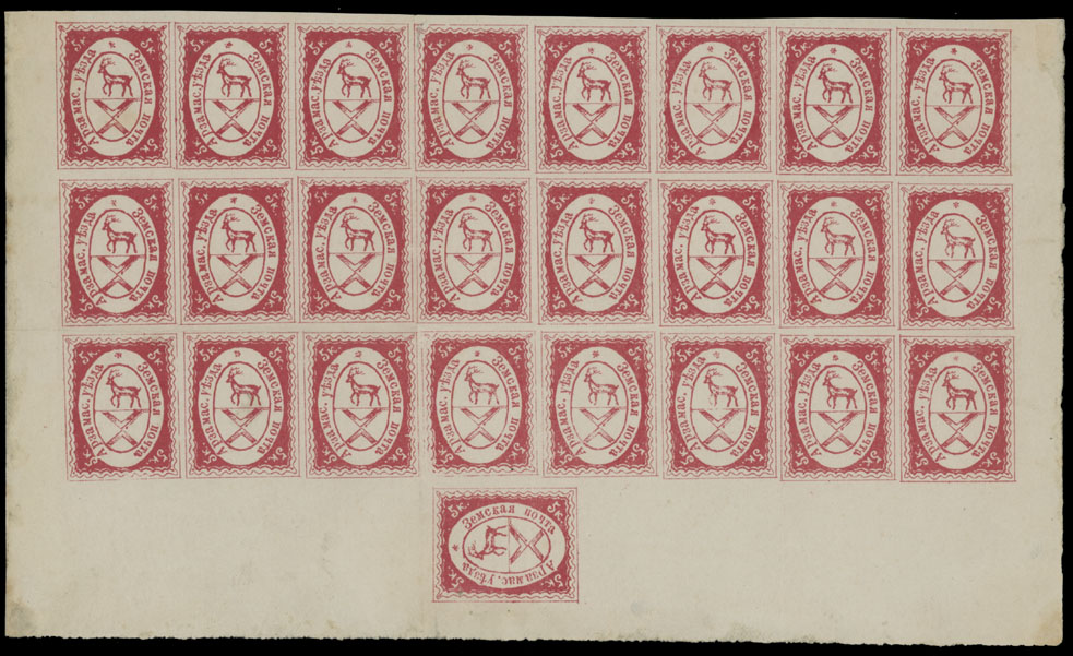 1877, Star at top, 5k dark red, complete sheet of 25 (8×3 and one sideways at the bottom, forming couche), several folds mostly between stamps, small repair at top of position 4, full OG, many NH stamps, VF and extremely rare, ex-Herrick and Bianchi, C.v. $5,340++, Est. $6,000-$7,000, Schmidt #4, 4S