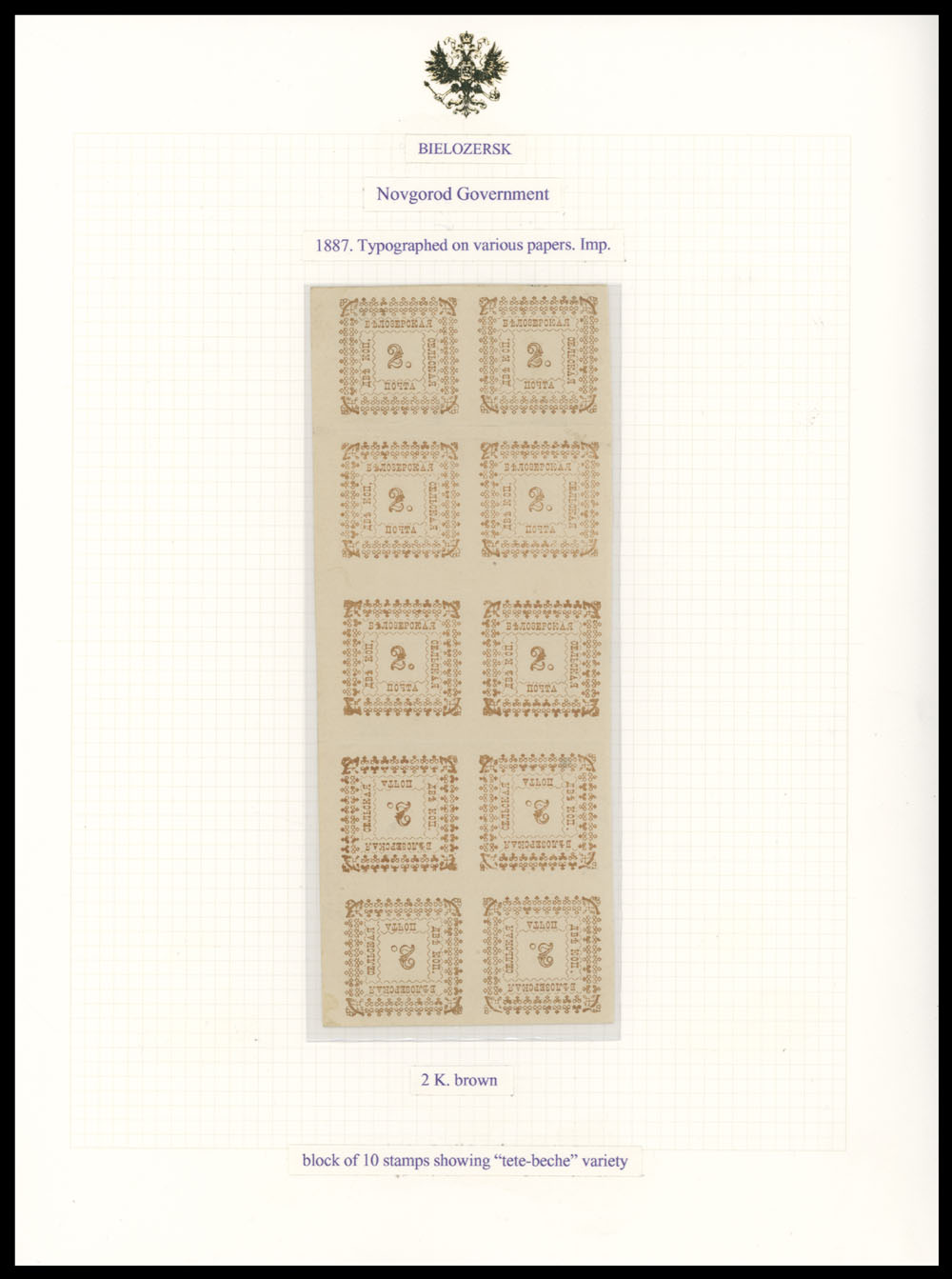 1887, 2k light brown, vertical gutter block of ten (a half of complete sheet), bottom block of four is inverted and forming two vertical tete-beche pairs, folds between stamps, arranged on page from the Bianchi Collection, full OG, NH or VLH (1), VF, C.v. $1,500++, Est. $1,200-$1,400, Schmidt #31, 31S