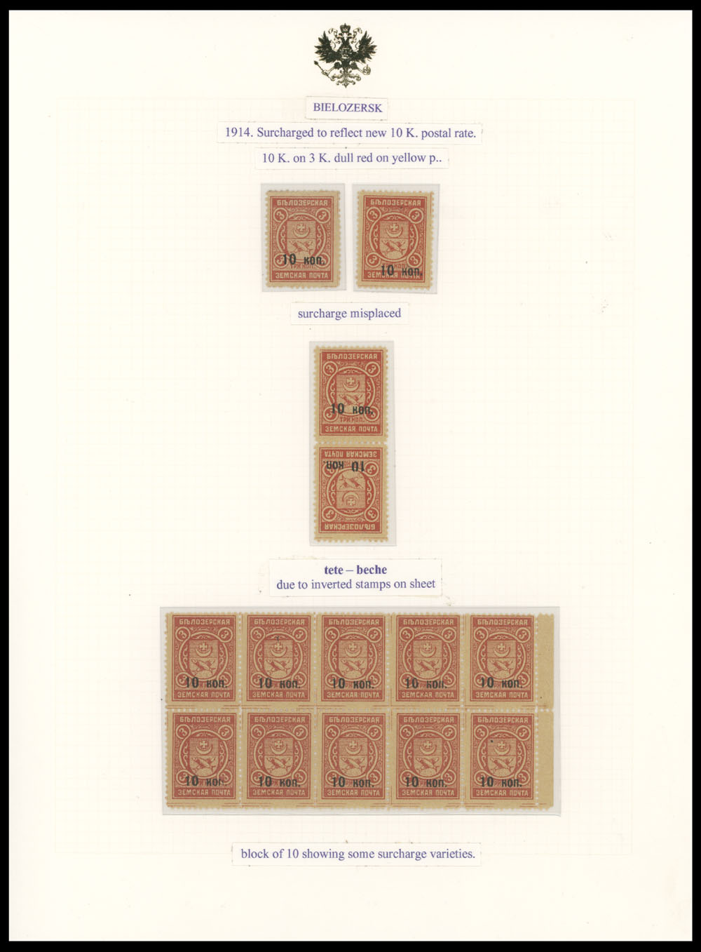 1914, black surcharge 10k on 3k red printed on yellow paper, two singles, one has shifted surcharge, vertical tete-beche pair and right sheet margin block of ten (5×2), choice singles and multiples representing most existing surcharge varieties, broken ”1” and ”0”, damaged letters, ”kog” variety and more, arranged on page from the Bianchi Collection, full OG, mainly VF, Est. $1,000-$1,200, Schmidt #111, S, var