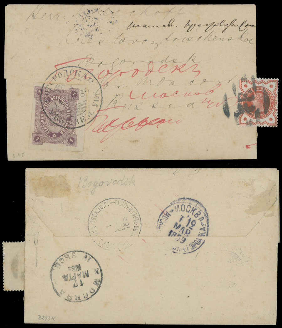 1889 (March 14), entire wrapper from England addressed to zemstvo, franked by Queen Victoria 1/2p vermilion, tied by ”F.B.” (Foreign Branch) obliterator, two different Moscow transit markings and Bogorodsk Imperial PO date stamp on reverse, Arms with Rhombuses 1k violet applied for local delivery, cancelled by zemstvo ”14.MAR.89” postmark, F/VF and rare, ex-M. Liphschutz, Est. $2,000-$2,500, Schmidt #45