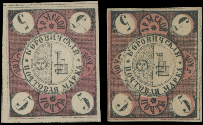 1868, two stamps of 5k black and red in distinctly different shades, one with background shifted to the left, part of OG, F/VF, C.v. $600, Est. $300-$400 , Schmidt #1, var