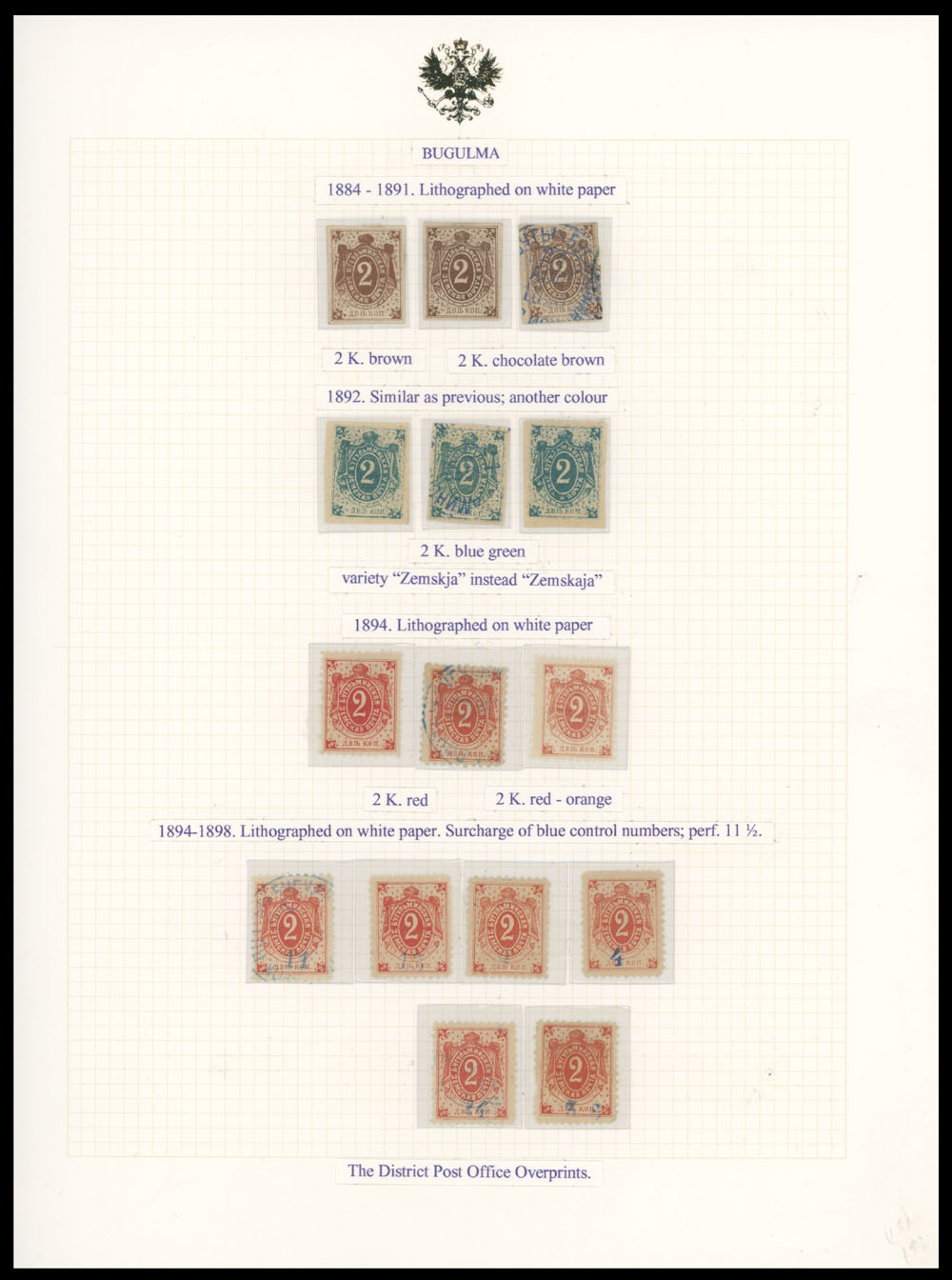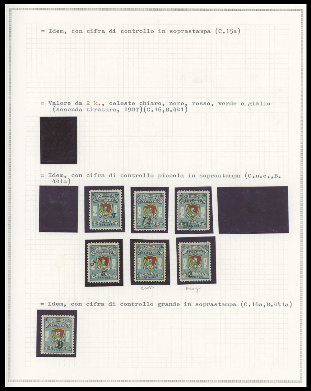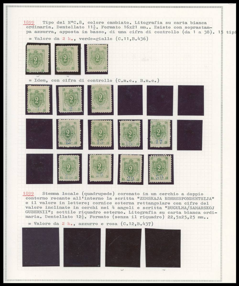 1884-1914, 48 mostly mint stamps (5 – cancelled by various zemstvo handstamps), arranged on 4 pages with Italian description, six of No.9 and eight of No.16 with overprints of control numbers, shade and type varieties, mainly fresh condition, full/part of OG or used, C.v. is well over $1,000, Est. $500-$600, Schmidt #6/21