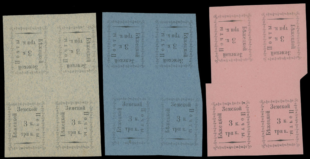 1893, Small Rectangle Design, 3k black on gray, blue and rose paper, three vertical tete-beche blocks of four, the last one some scissors’ separation, full OG, hinged on top stamps, VF, C.v. $1,200++, Est. $600-$700 , Schmidt #14S, 16S, 17S