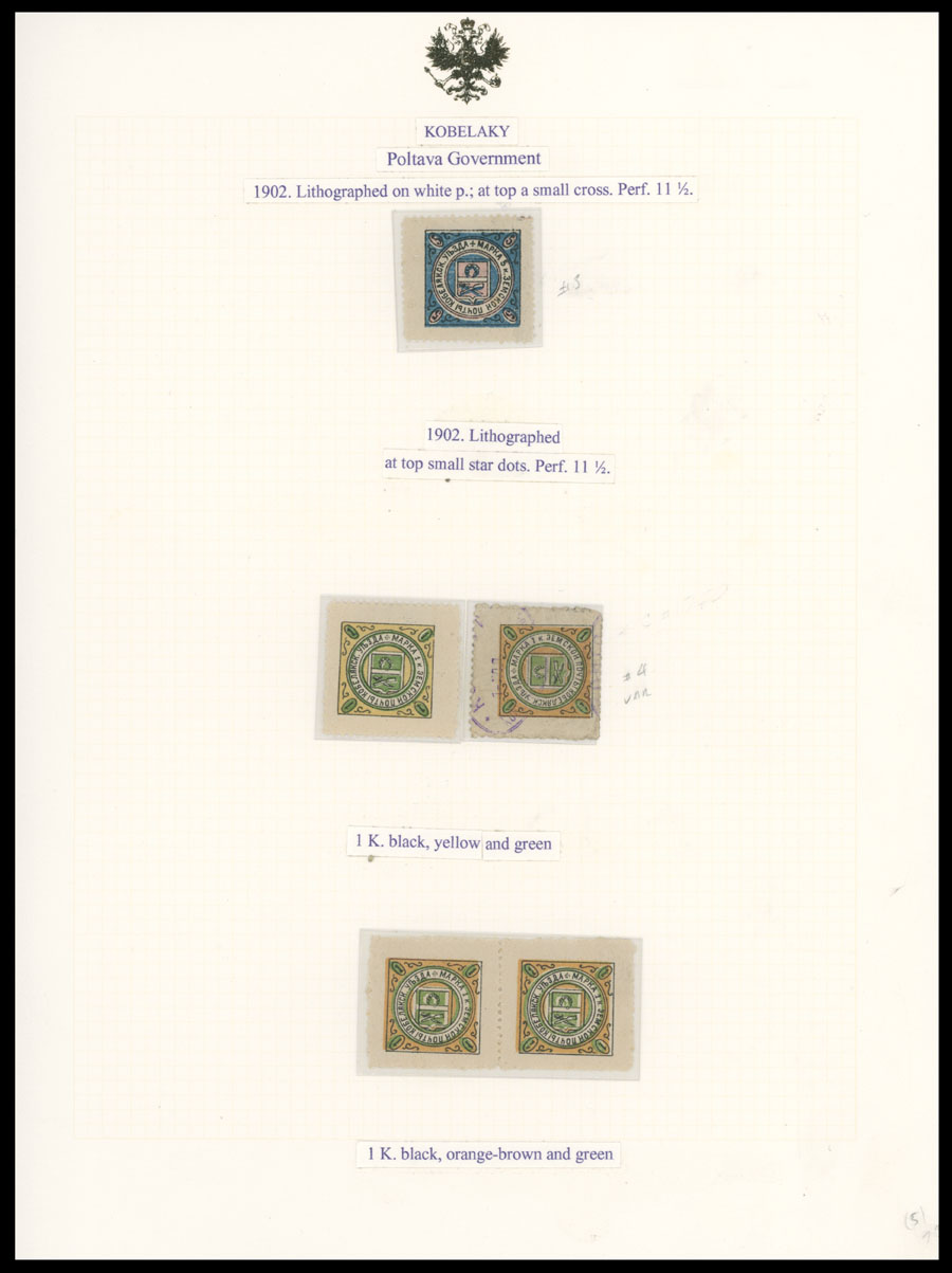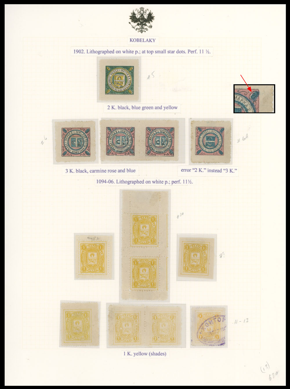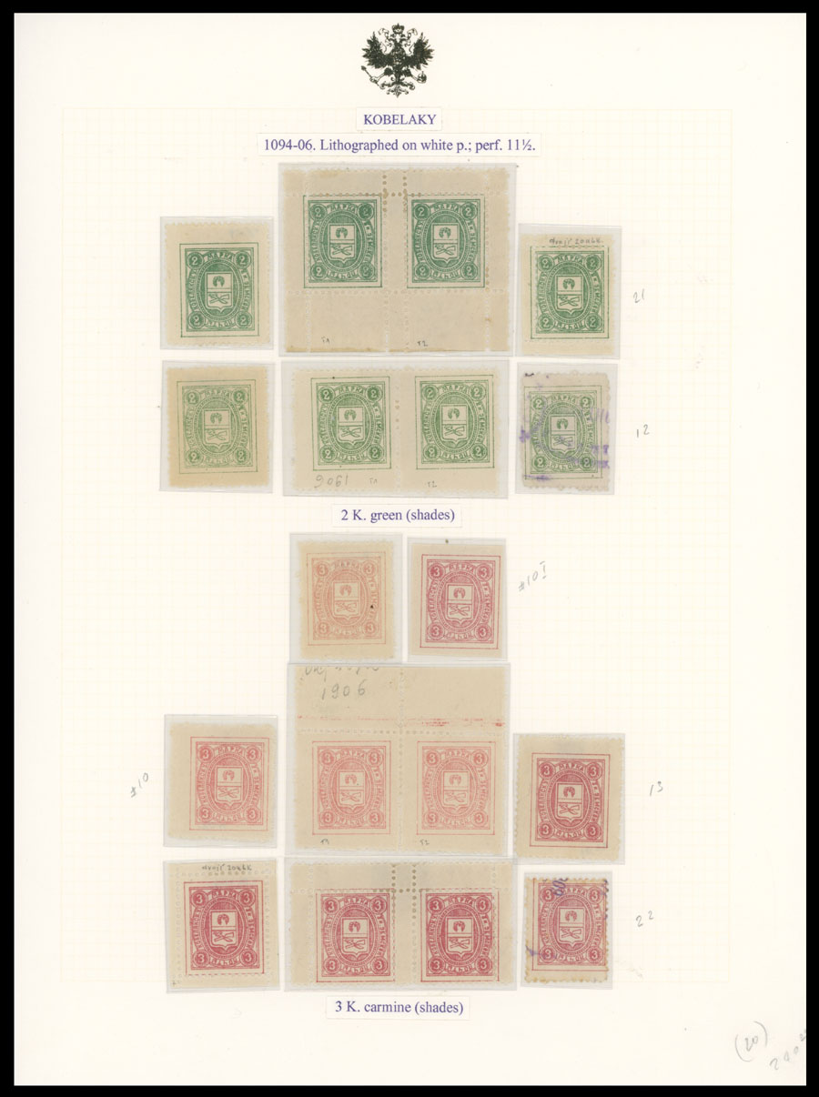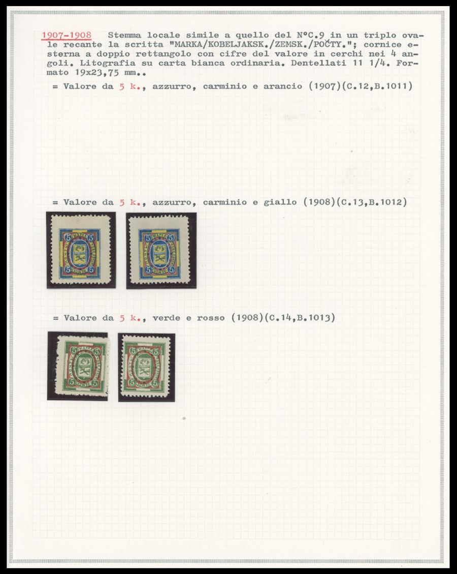 1902-08, 40 mostly mint stamps (3 – used) arranged on four pages from collections of Italian origin, including nice range of Arms in circular design (No.3-6) with error 2k instead of 3k with part of OG (No. 6A), then shades, types, sheet layouts and etc. varieties on Arms in oval in singles, pairs and gutter pairs, minor flaws possible, still F/VF, C.v. is over $2,700, Est. $1,200-$1,500, Schmidt #3/25