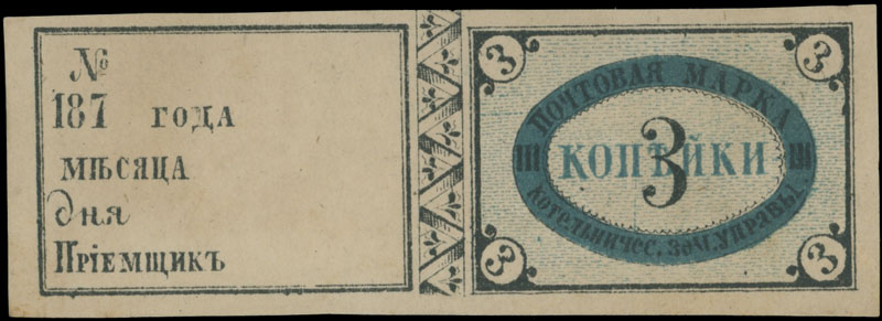 1870-71, 3k black and blue with counterfoil at left, unused, no gum, F/VF, ex- Liphschutz, C.v. $1,500, Est. $600-$700 , Schmidt #6