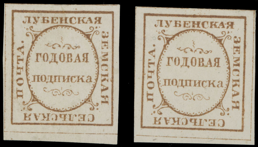 1883, Annual Subscription, no value indicated in yellow brown, two singles printed on wove paper, one has a dot between ”a” and ”ya” in ”Lubenskaya” variety, full/large part of OG, VF, C.v. $600, Est. $300-$350 , Schmidt #6, var