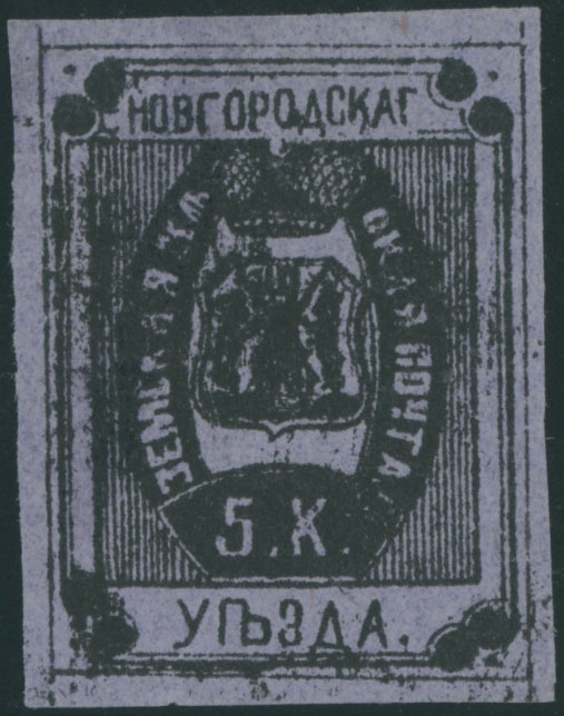 1880, text at top ”NOVGORODSKAG”, 5k black printed on violet paper, large part of OG, mostly VF and scarce, rank ”R”, C.v. $800, Est. $600-$700 , Schmidt #8