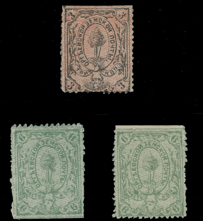 1879, small size stamps, 3k black on red network and two of 6k green with green network, different shades, large part of OG, F/VF, C.v. $600,,Est. $400-$500 , Schmidt #7, var, 8