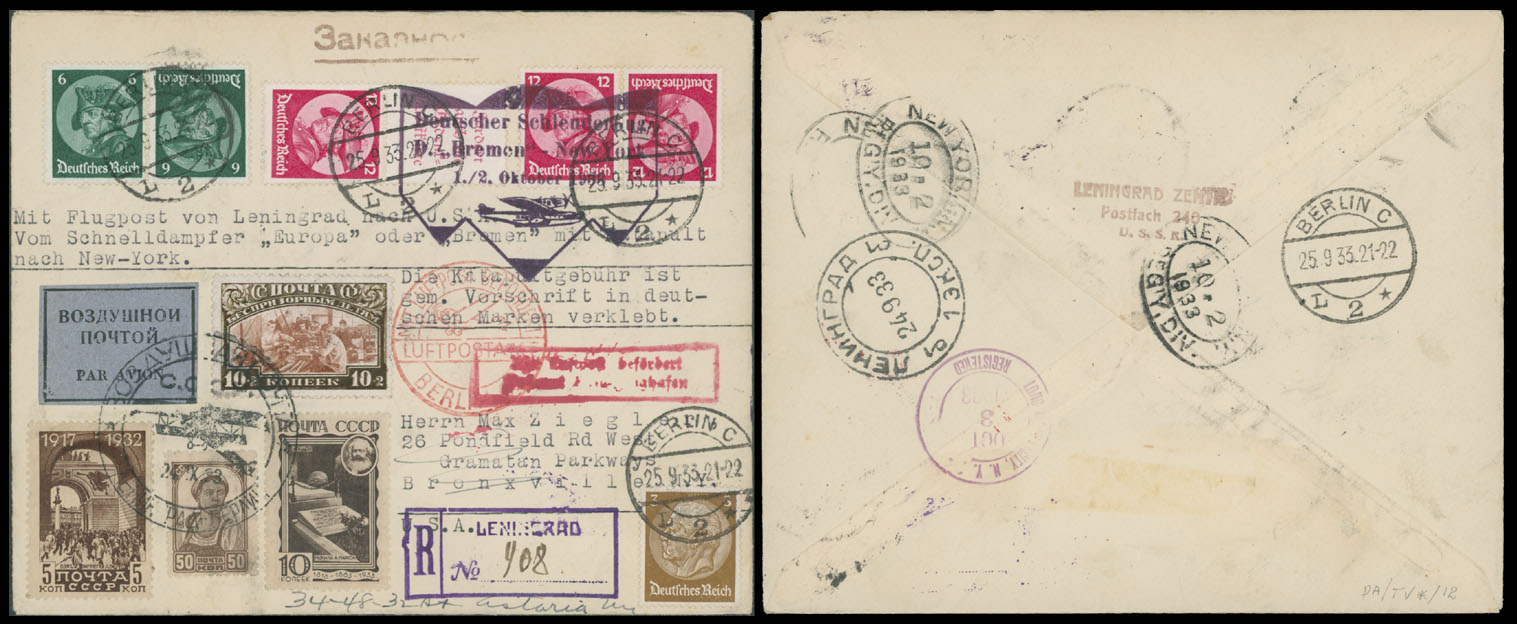 1933 (October 1-2), registered cover from Leningrad to USA, delivered with Pioneer Flight Leningrad – Berlin on September 24, franked by four Soviet adhesives and upon arrival to Germany uprated by six values, including two-tete-beche pairs, posted to S.S. Bremen and delivered by Catapult Flight to NYC, all appropriate markings and arrival ds, mostly VF, Est. $500-$600