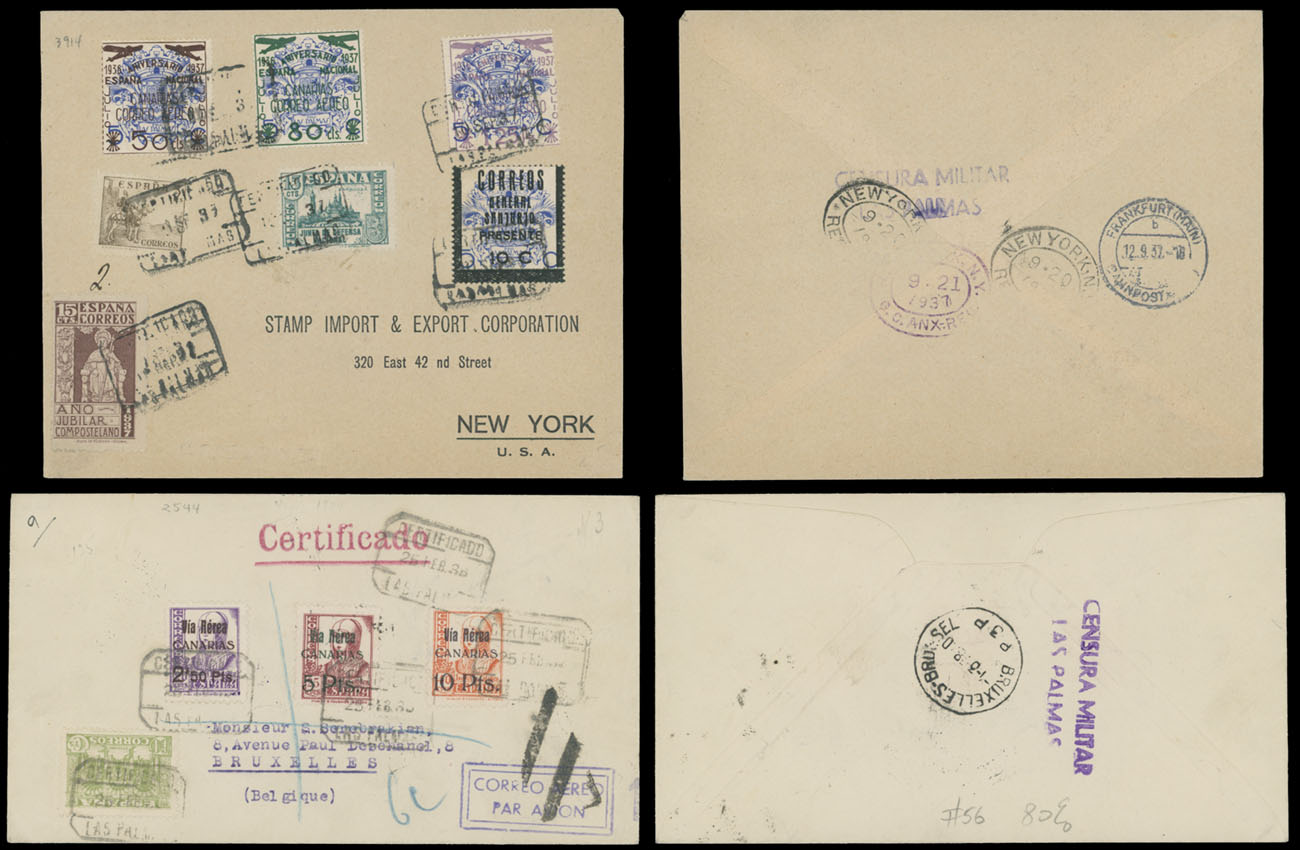 1937-38, two covers franked by complete Canary surcharged air post sets mixed with Spanish adhesives, first one addressed to US with airplane delivery to Frankfurt (Main) and then by train and vessel to New York, the other one presumably was sent to Brussels by several connected flights, all appropriate markings and arrival ds, mostly VF, Est. $200-$250, Scott #9LC31-33, 9LC51-53