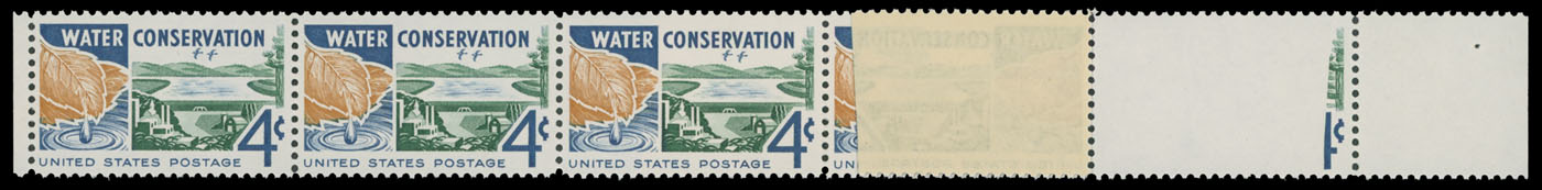 1960, Water Conservation, 4c dark blue, brown orange and green, side margin horizontal strip of five, right stamp has brown orange missing due to extraneous paper over the design, full OG, NH, VF and very rare, according to the Scott Errors Cat. only four such errors known, C.v. $2,750, Est. $2,000-$2,500, Scott #1150a