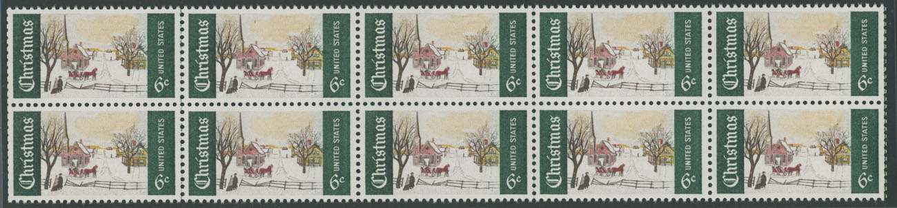 1969, Christmas issue, 6c dark green and multicolored, light green color omitted, block of ten (5×2), full OG, NH, VF, C.v. $300 as singles, Est. $150-$180 , Scott #1384c