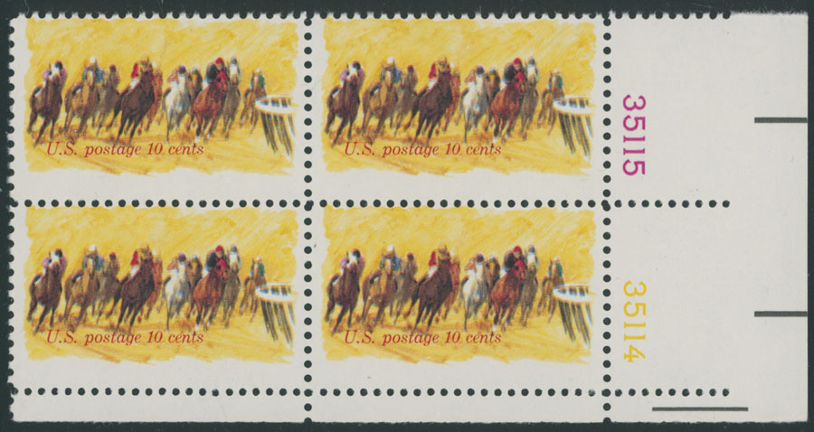1974, Horses Rounding Turn, 10c yellow and multi, bottom right corner sheet margin plate No.35115-35114 block of four, blue ”Horse Racing” omitted, red color (US Postage 10 cents) shifted to the top, full OG, NH, VF, C.v. $2,000 as singles, Est. $1,000-$1,200, Scott #1528a