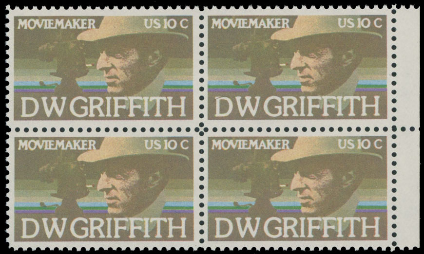 1975, David W. Griffith, 10c multicolored, brown (engraved) color omitted, right sheet margin block of four, full OG, NH, VF, C.v. $1,000 as four singles, Est. $400-$500 , Scott #1555a
