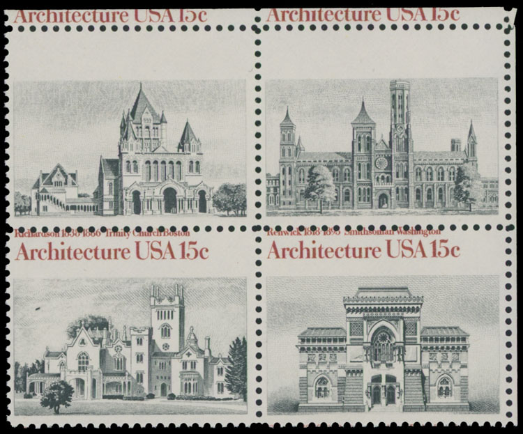 1980, Architecture, 15c x4 black and red, top right corner se-tenant block of four, upper stamps (No.1839-38) have missing red color due to strong perforation shift, full OG, NH, VF and scarce, C.v. $400, Est. $300-$350 , Scott #1841b