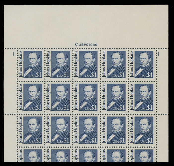 1989, John Hopkins, $1 dark blue, pane of 15 plus 5 top halves at foot due to considerable and unusual miscut, plate No.1 at left and right, top margin is approximately 35mm, full OG, NH, VF and very rare, Est. $1,000-$1,200 , Scott #2194d, var