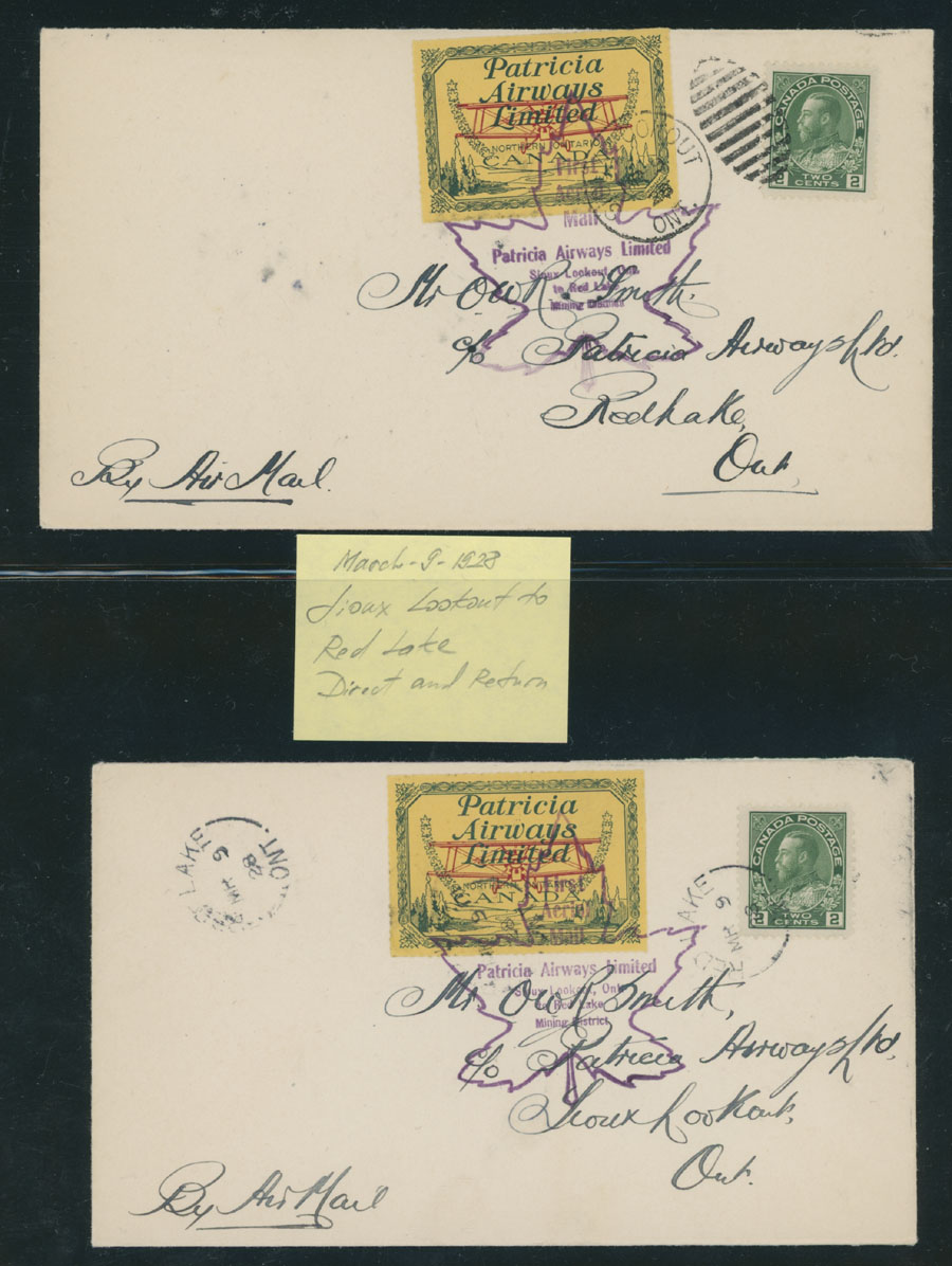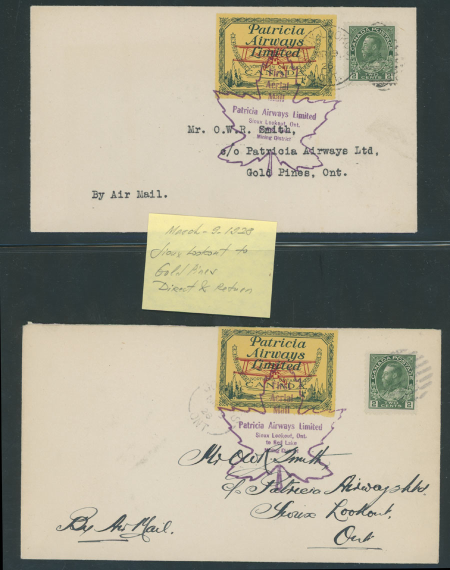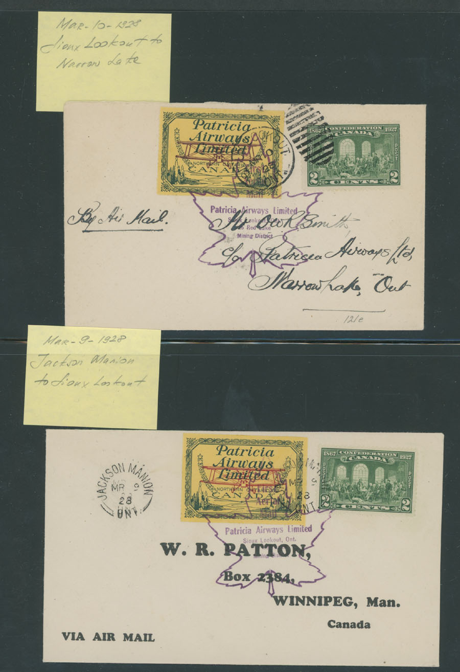 1928 (March 9-10), Patricia Airways Limited, group of 11 different Direct and Return flights from/to Sioux Lookout, itineraries includes Gold Pines, Red Lake, Jackson Manion, Rainbow Lake and etc., franked by 2c postage and bearing (10c) green and red on yellow paper, confirmation marking in violet, all with arrival ds, mostly VF, Unitrade C.v. CAD$1,925, Est. $800-$900, Scott #CL43